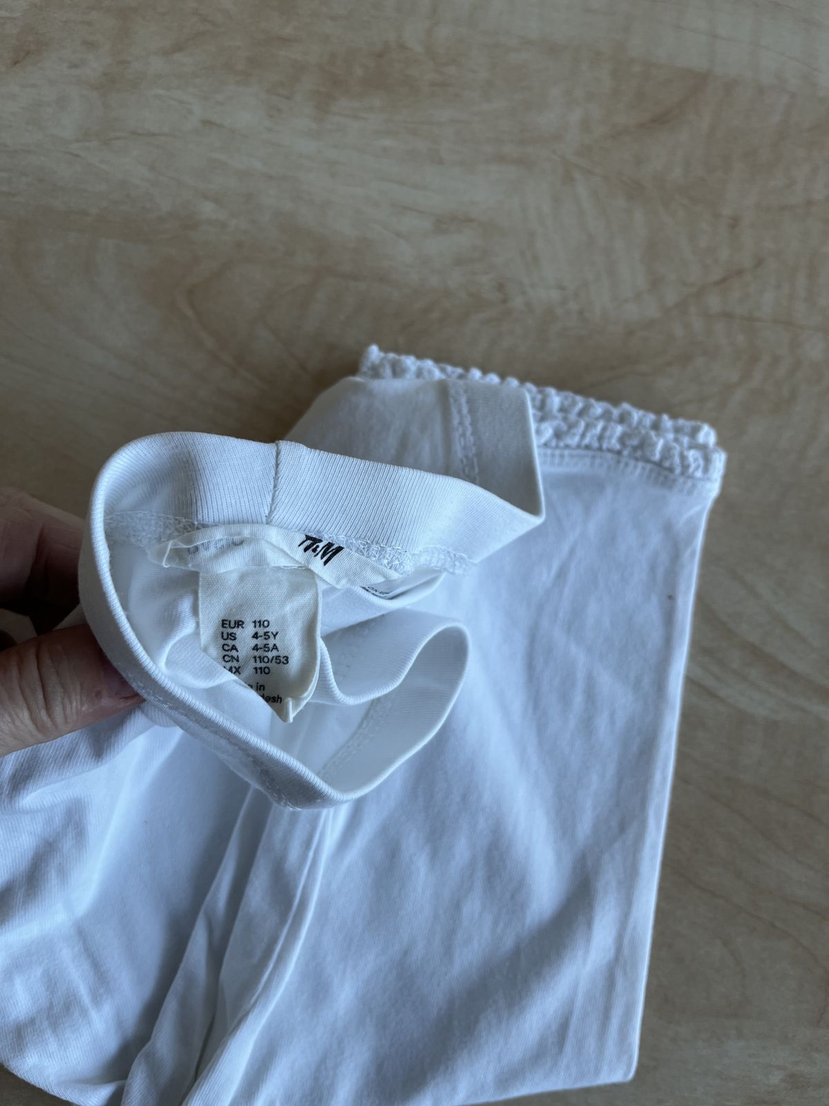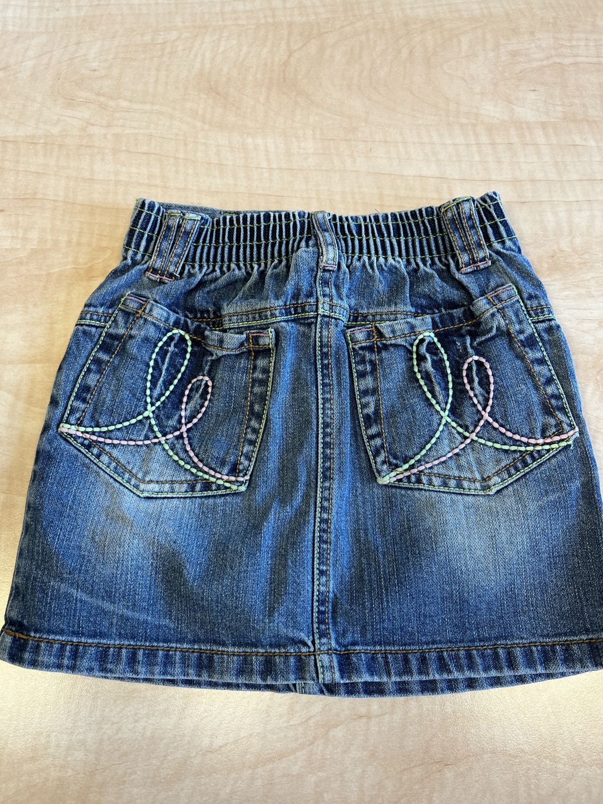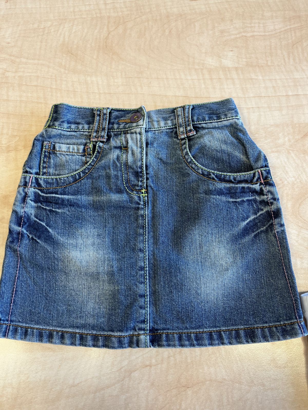Džínová sukně vel. 104 , bílé legíny vel. 110.