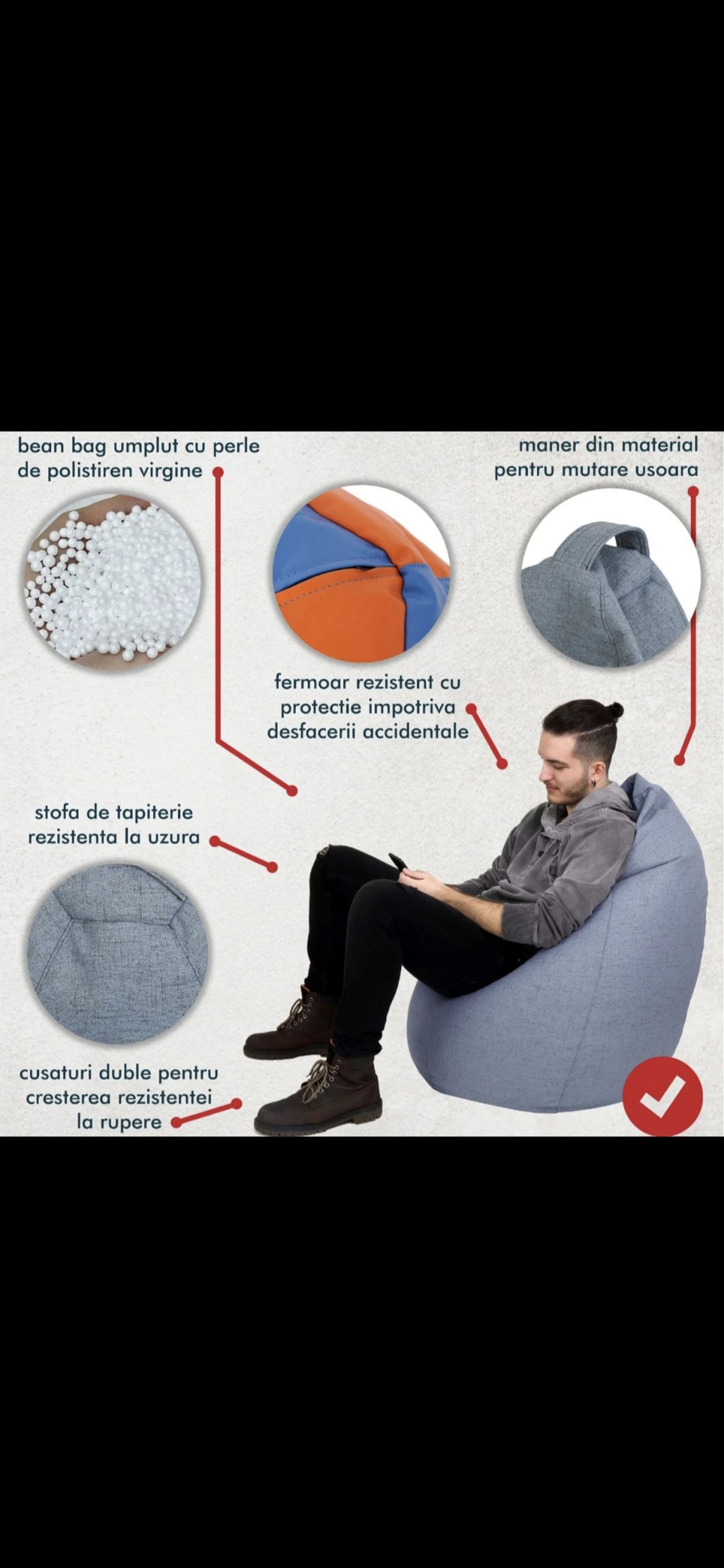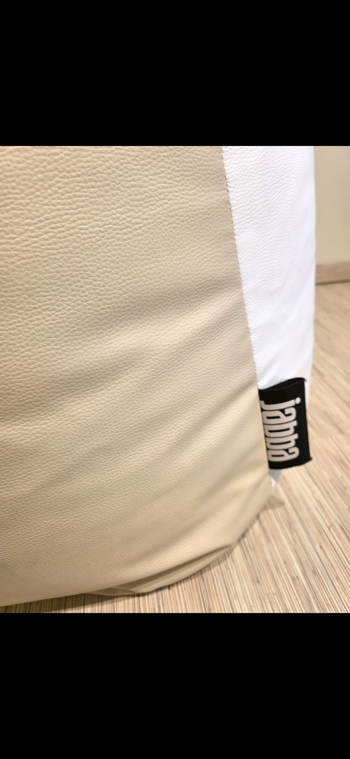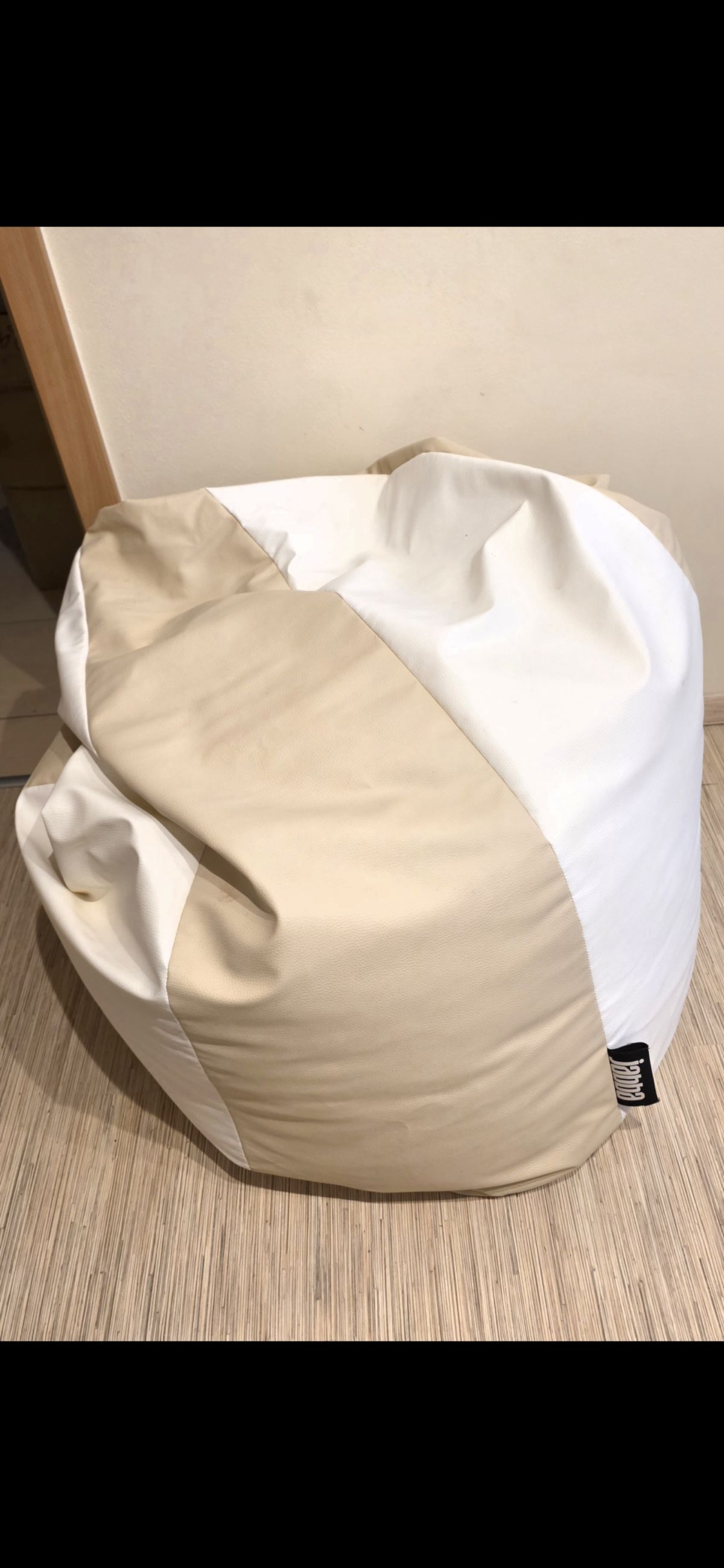 Má průměr podstavce 74 cm a unese maximální hmotnost 120 kg. Jeho výška je variabilní, přibližně 77 cm. Sedací vak je vyplněn polystyrenovými korálky, které se přizpůsobí tvaru těla a vytvářejí prostor vhodný pro úplnou relaxaci. Je potaženo krémově bílou imitací kůže , což je odolný materiál, který se snadno tvaruje a umožňuje pohyb korálků uvnitř. Díky nízké hmotnosti a rukojeti proti nechtěnému otevření.