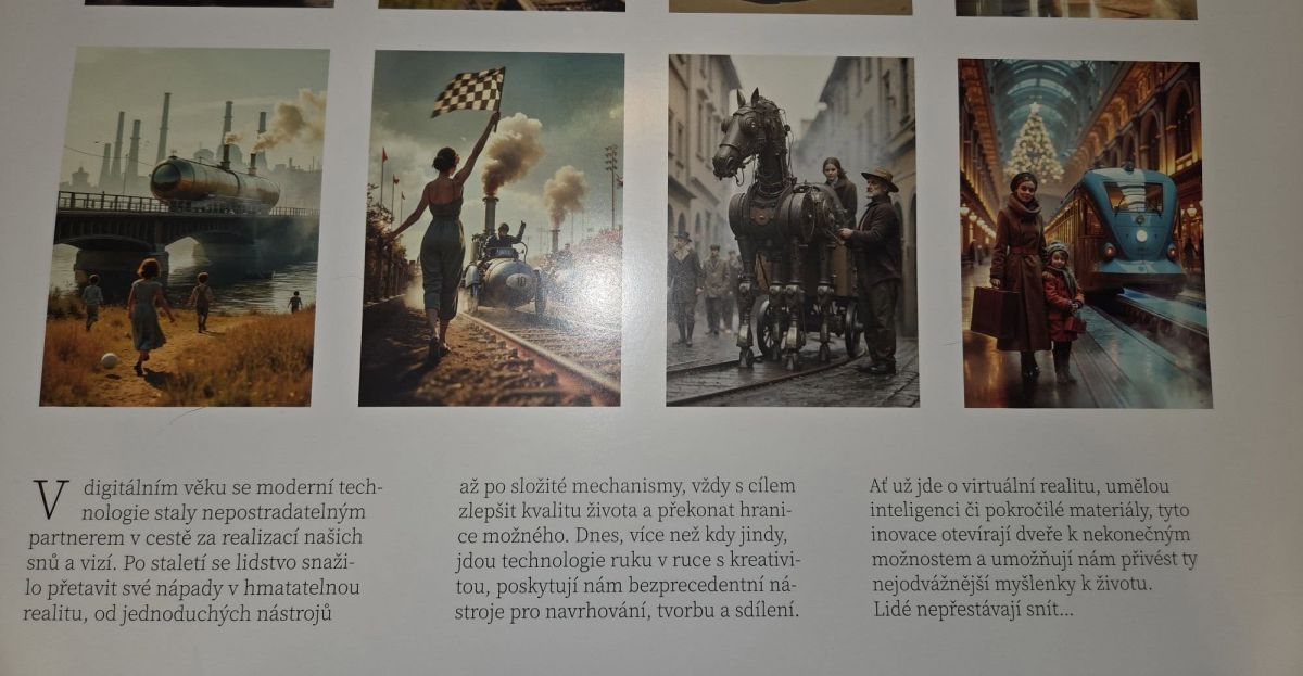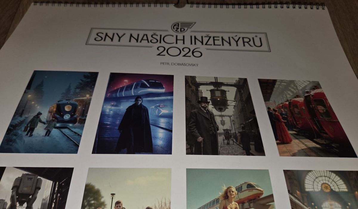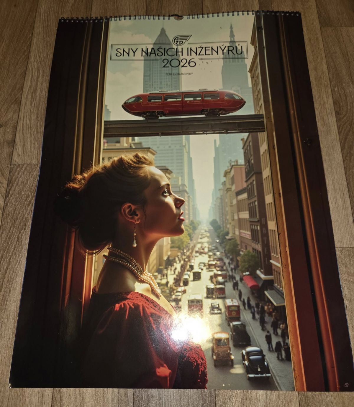 Velký nástěnný kalendář na rok 2026 - Sny našich inženýrů. Od firmy AŽD. Rozměry 60 x 42 cm.