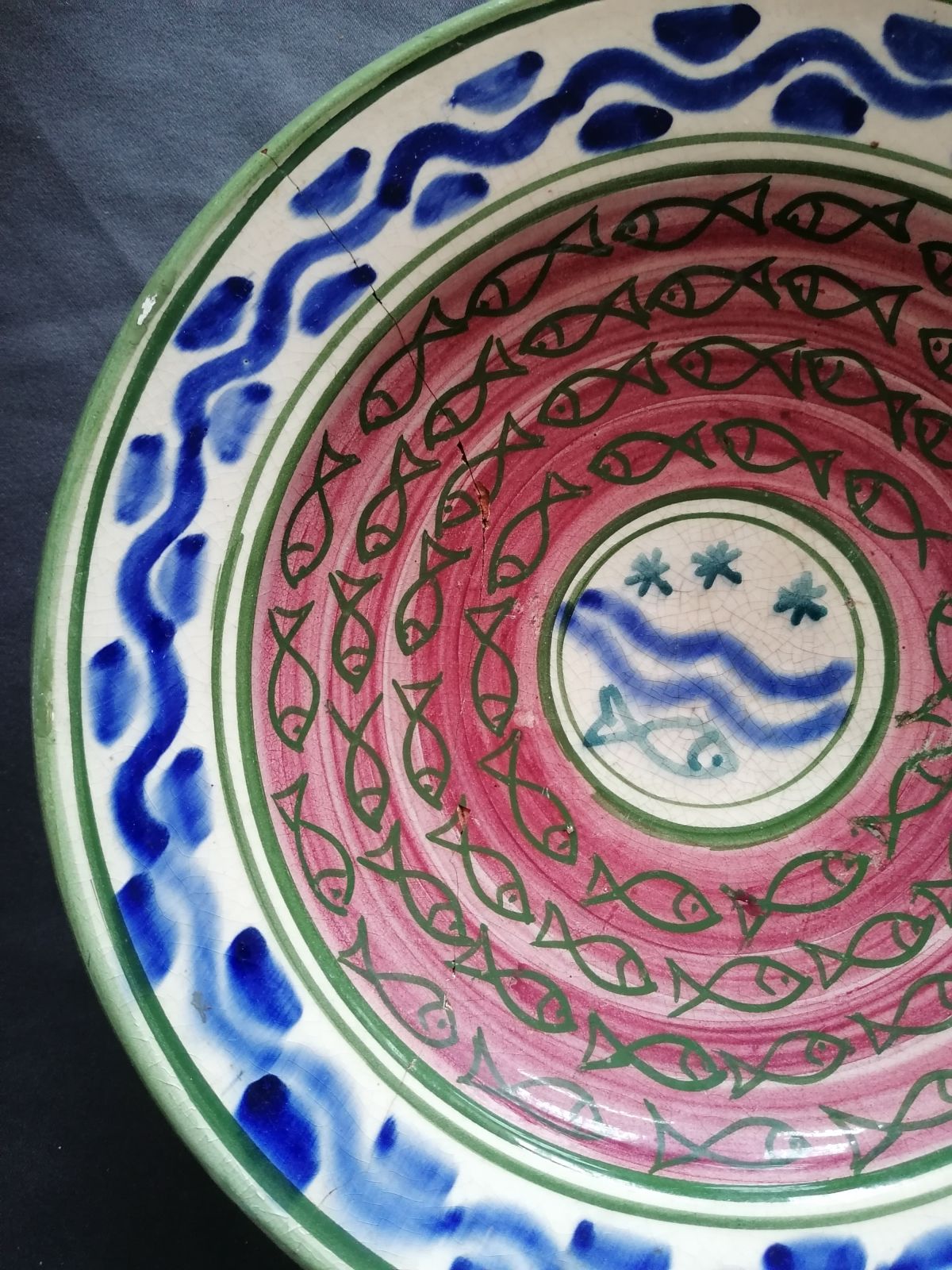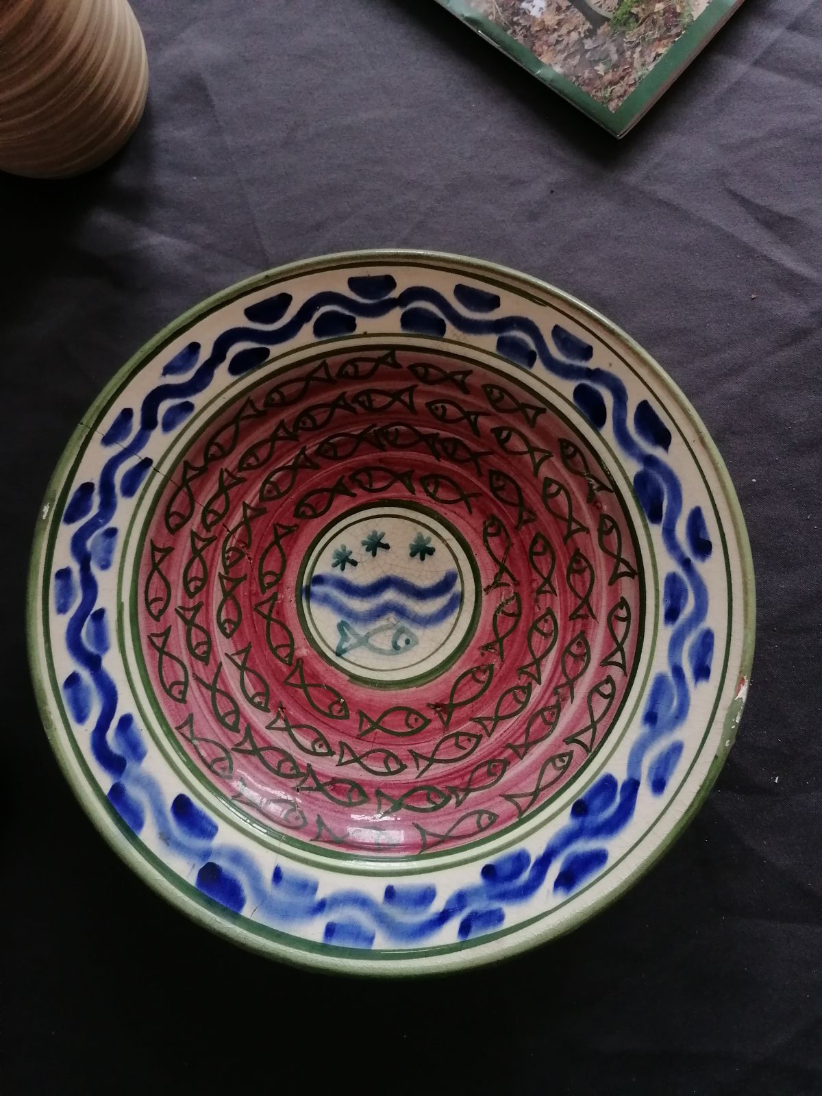 Daruji za odvoz krásný ručně malovaný hluboký talíř, koupený ve Francii. Vhodný jako mísa na ovoce nebo dekorace (díky drátu na zadní straně se dá pověsit). Stav: viz. foto. Průměr: 27 cm