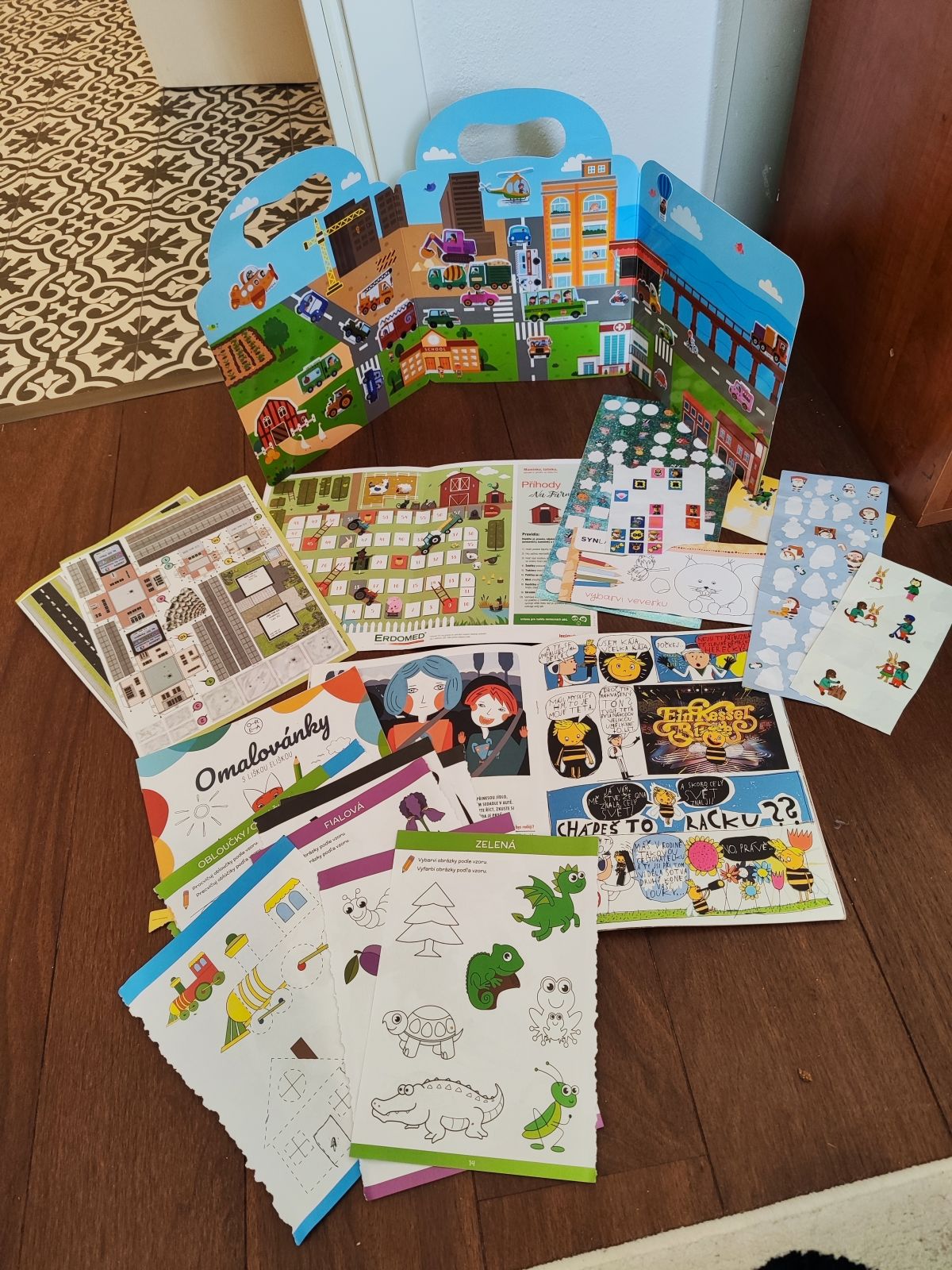 Daruji za odvoz ruzne zbytky tvoreni pro deti - nalepky, omalovanky, vystrihocanka z ABC, casopis Raketa, pracovni listy, velka knizka ma opakovane pouzitelne nalepky, ktere je mozne na obrazku premistovat.
