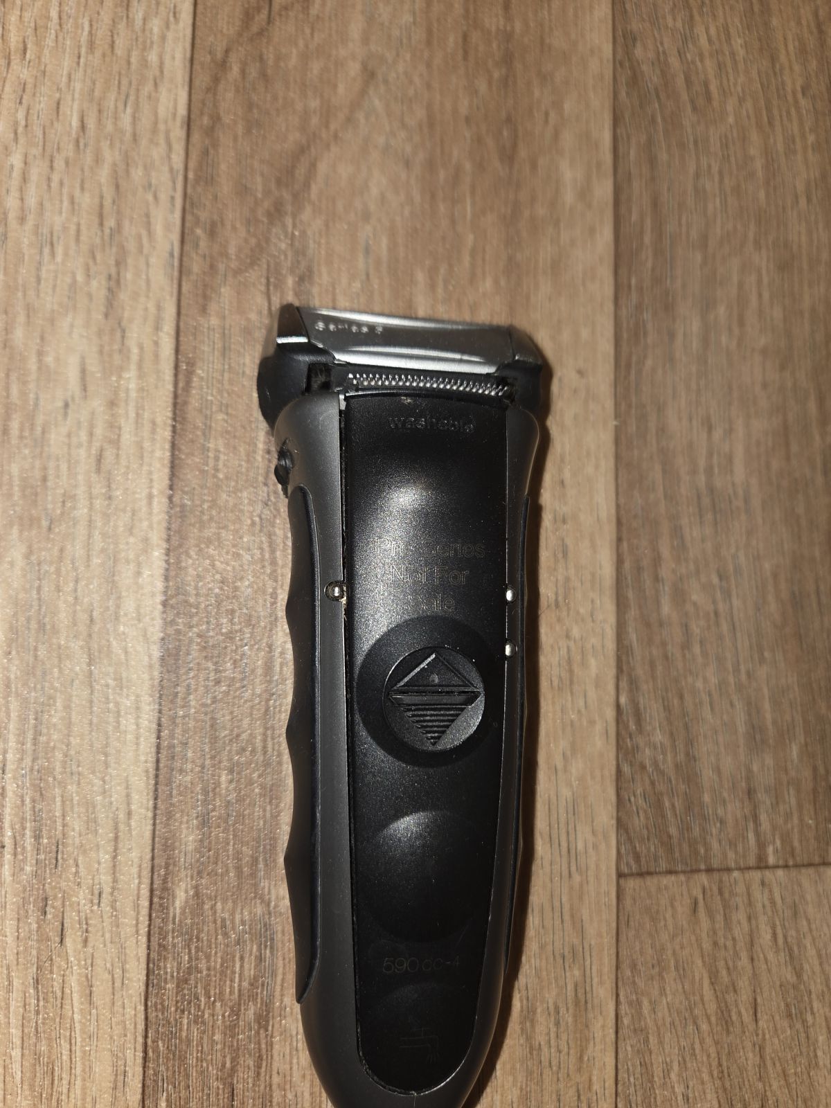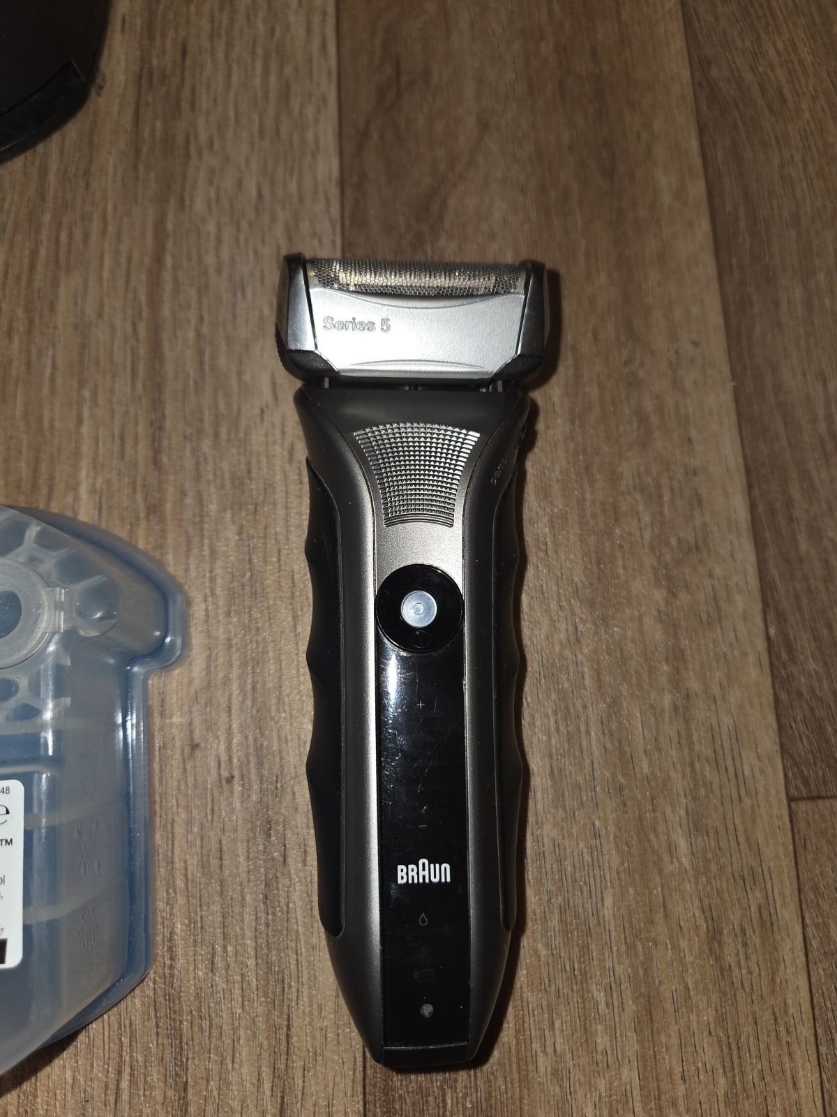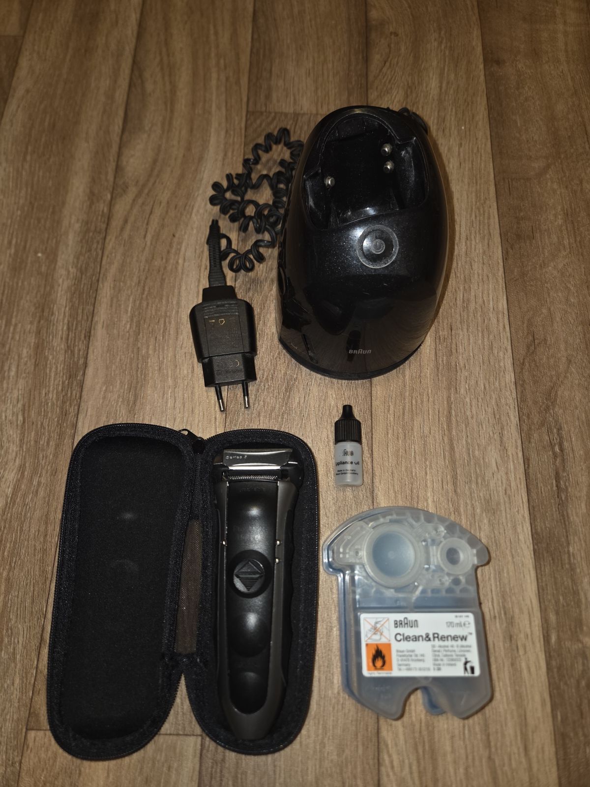 Starší a používaný holící strojek. Stále je funkční, i když už má něco za sebou. Stáří 8 a více let. Byl zemřelého partnera, nalezený ve skříni. To modré je nějaká čistící tekutina do nabíjecí stanice, v té malé lavičce je už jen trochu, ale nevím, co to je.