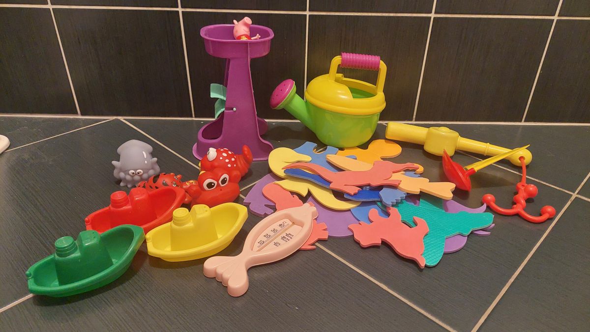 Daruji za odvoz hračky do vany + teploměr. Gumové krabíky a oliheň možná bude třeba vyhodit - špatně se z nich vylévá voda a mohou být uvnitř plesnivé. Jinak v dobrém použitém stavu.