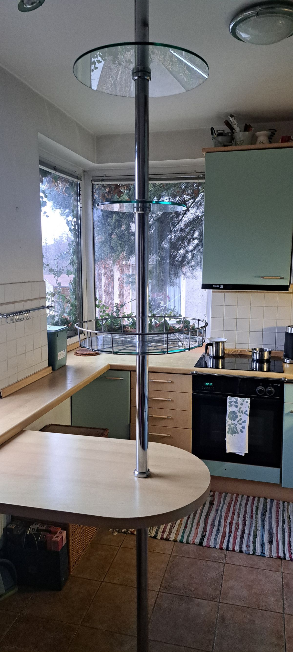 Daruji za odvoz tuto dekorativní nerezovou tyč s uchycením do stropu a podlahy s kulatými skleněnými policemi a jedním nerezovým kulatým košem.