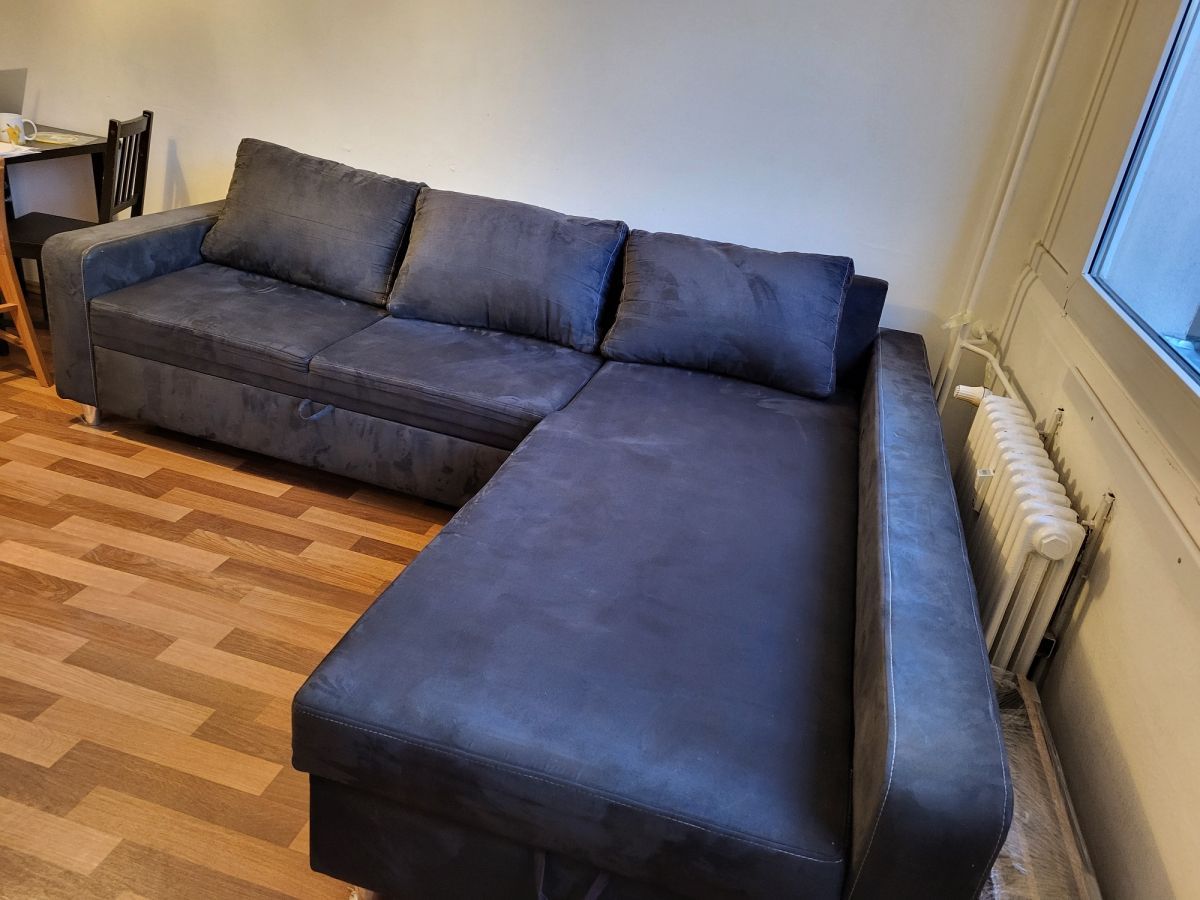 Daruji za odvoz a odnos černý látkový gauč se semišovým vzhledem. Gauč je asi 10 let starý, lehce vrže, ale je zachovalý a plně funkční.