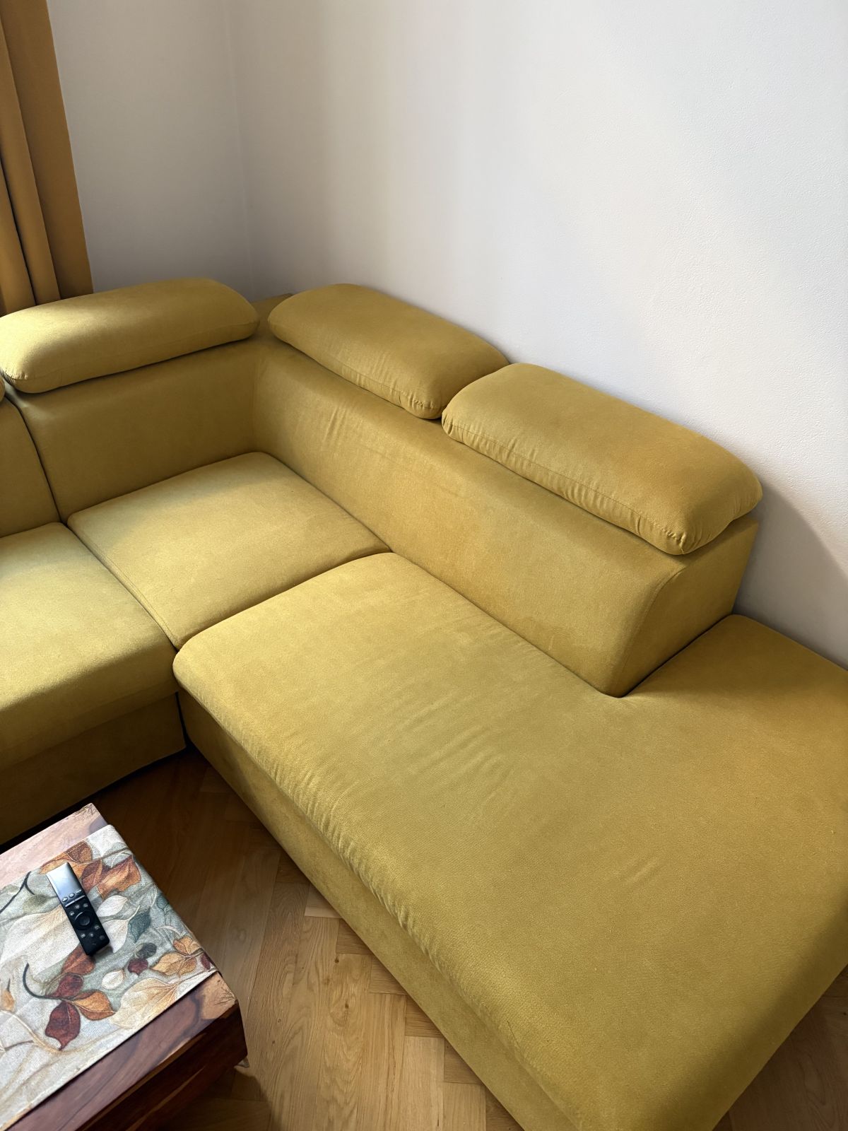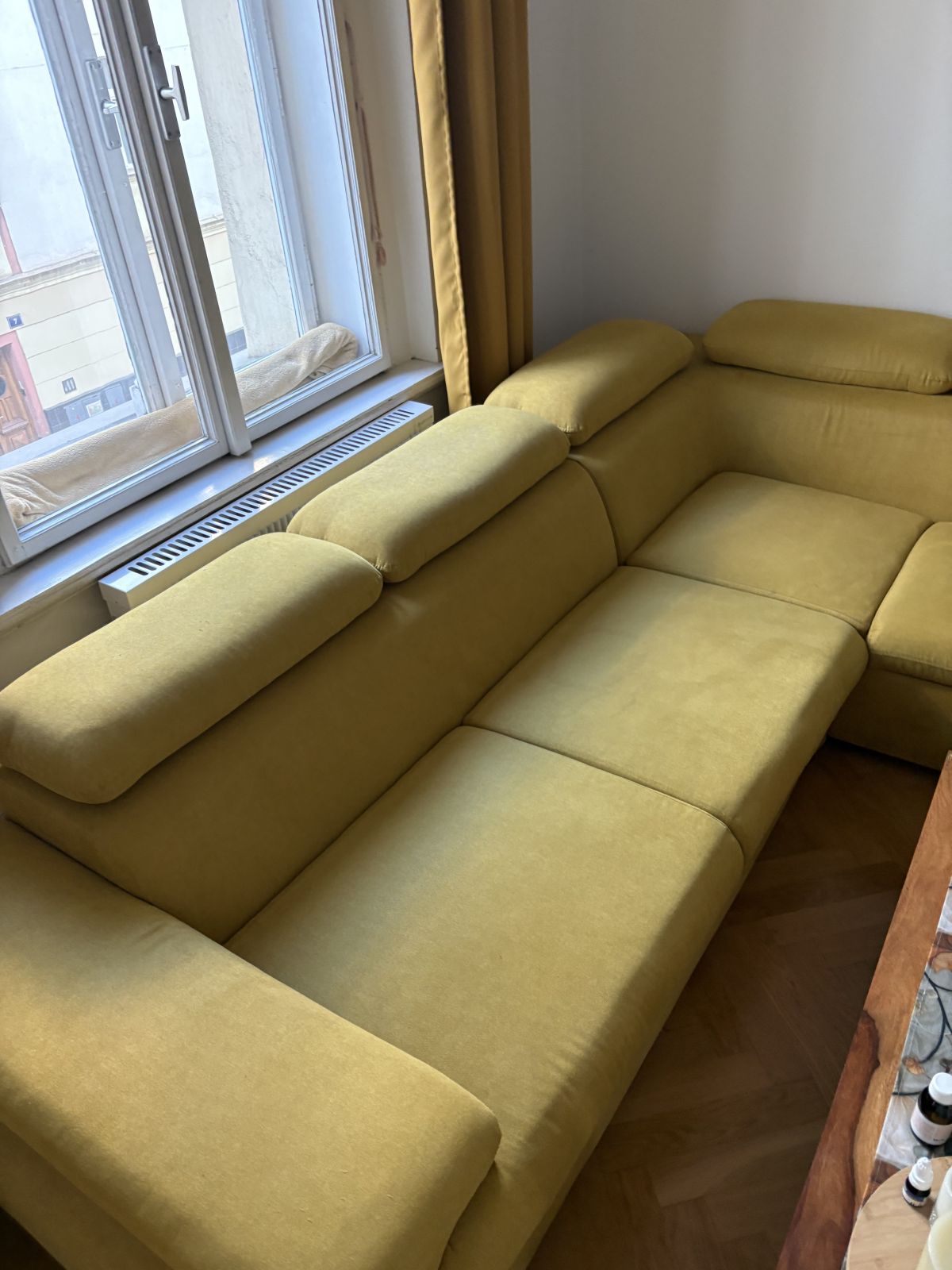 Rohová sedací souprava žluté hořcicové barvy, používaná 3 roky. Vady na kráse možno poslat na WhatsApp (místy skvrny a škrábance). Velký úložný prostor přes jedno křídlo. Rozkládací. Velmi dobrý stav.