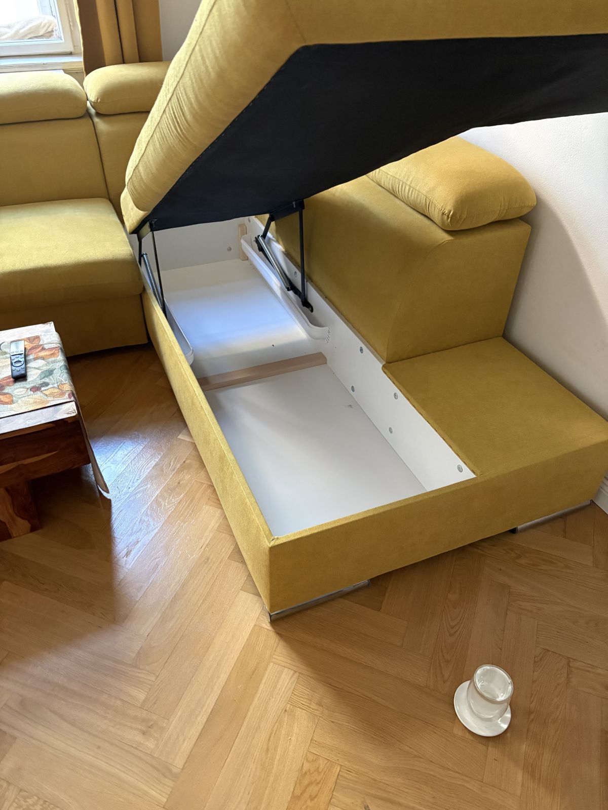 Rozkládací sedací souprava s úložným prostorem přes jedno křídlo. 3 roky používaná, místy fleky na potahu. Celkově v dobrém stavu.