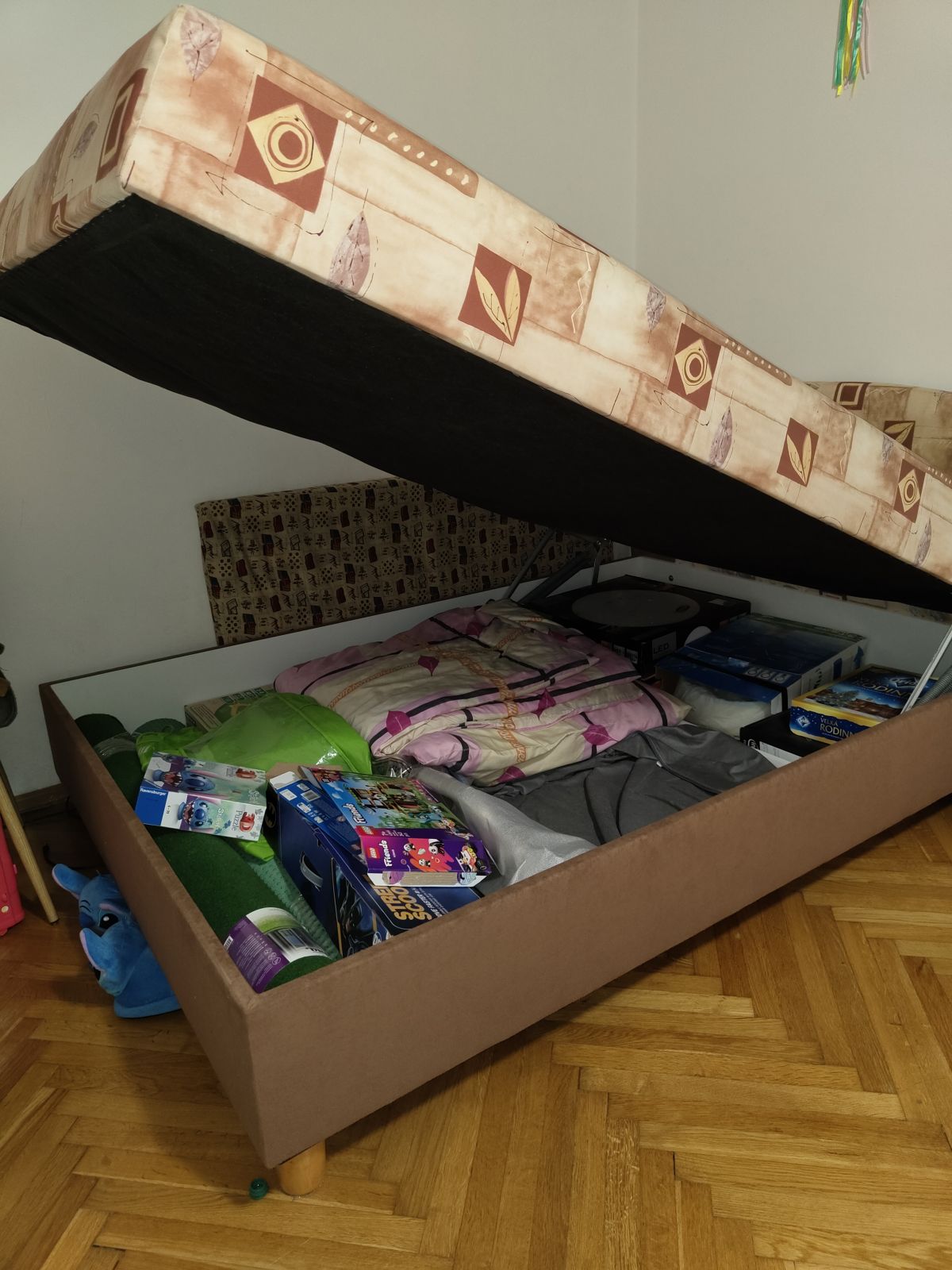 Daruji za odvoz Postel 140x200 cm. Za odvoz. Spala na ni dcera. Pořízeno ve Sconto. Úložný prostor je velký,spodní deska je prohnutá,ale to není zvenčí vidět a úložný prostor je funkční. Odvoz ideálně sobota 14.3.2026, je třeba si sami odnést z pokoje, bydlím ve zvýšeném přízemí:-) Čelo se dá oddělat, postel převázat, aby se při snesení neotevírala. Nožky jdou také odšroubovat.