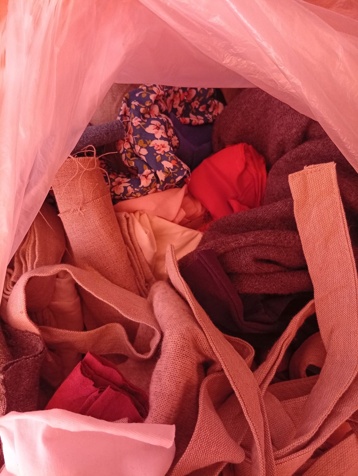 Různé látky. Menší i trochu větší kusy. Celkem cca 6 kg. Na tvoření.