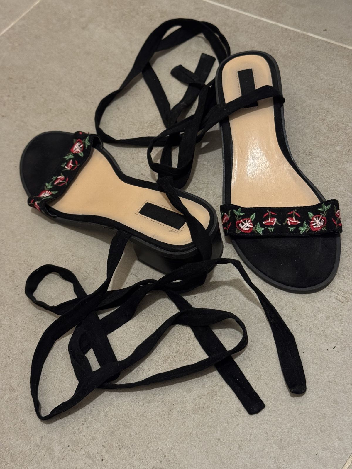 černé sandálky na mírném pdapatku s vázáním kolem lýtek