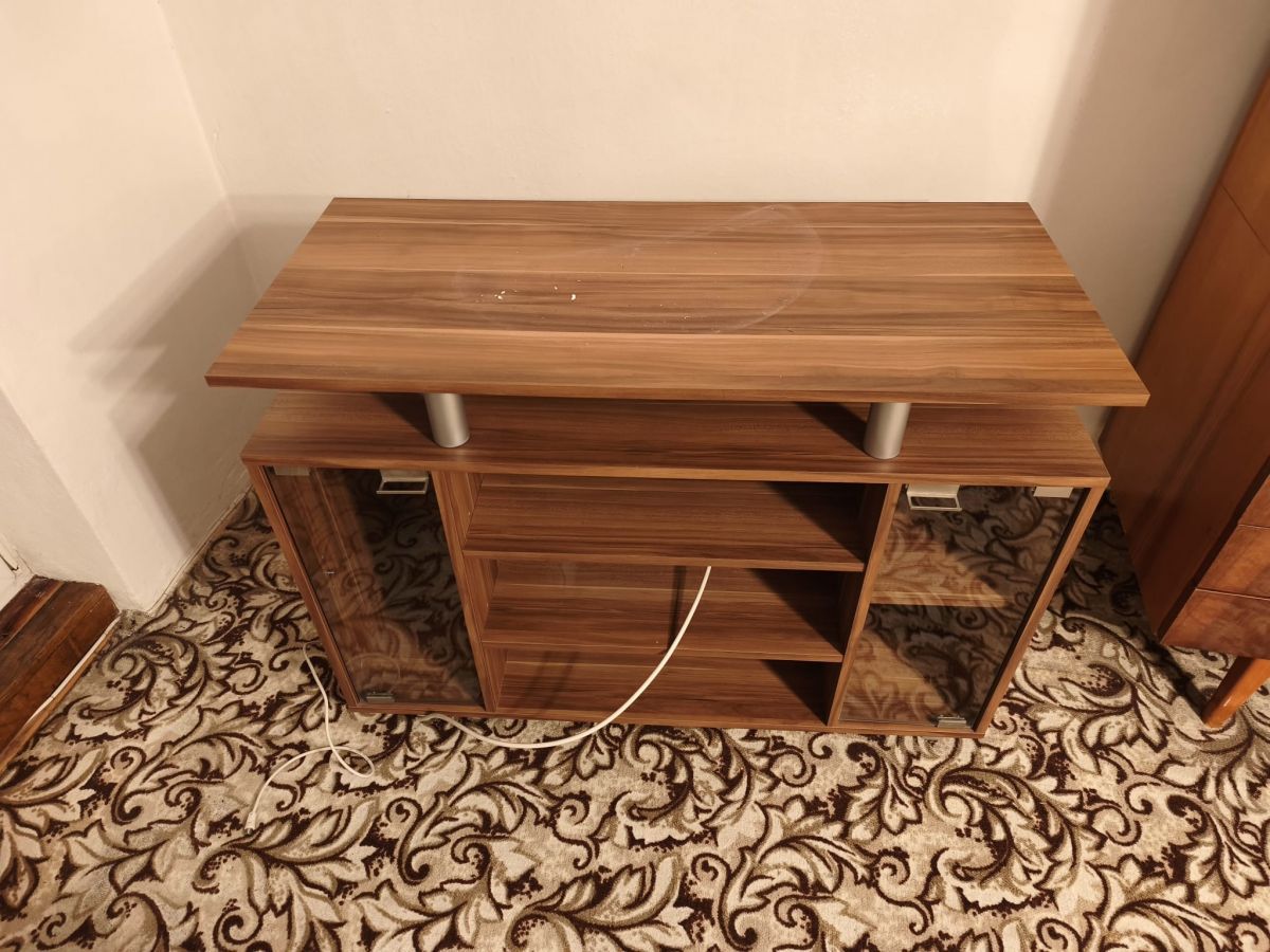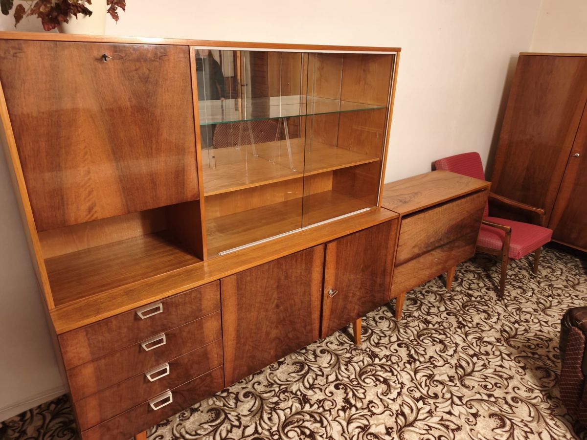 Daruji za odvoz - retro nábytek z 60. a 70. let. sestava obsahuje vysokou prosklenou skříň (sekretář) a širokou komodu se zásuvkami na nožičkách. nábytek je v zachovalém stavu + novější TV stolek