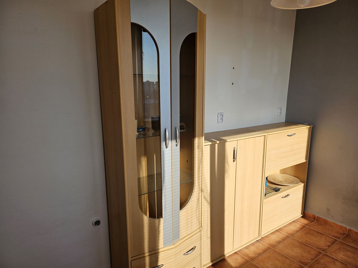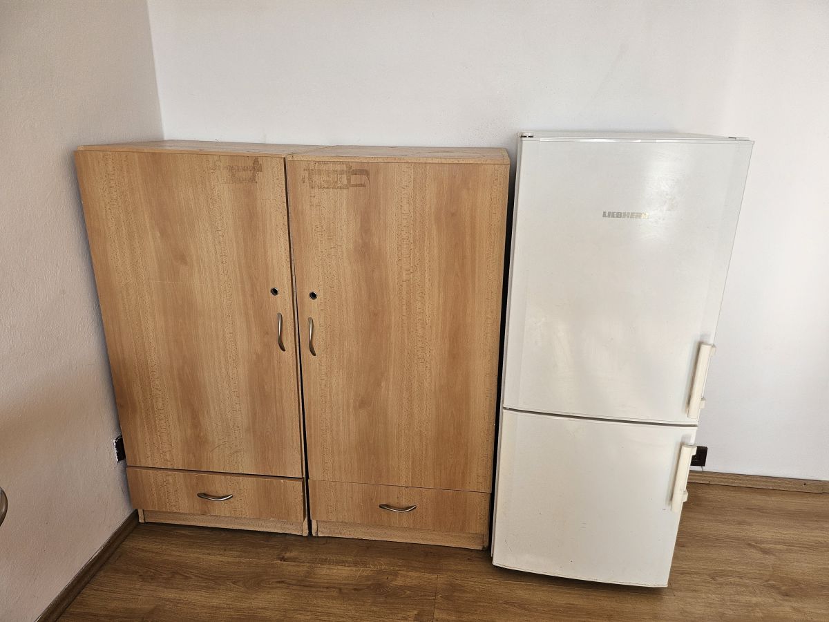 Daruji za odvoz dvě vyšší skříně a obývací stěnu ve světle dřevodekoru. Nábytek je používaný, v zachovalém stavu, vhodný např. na chalupu, do podnájmu nebo studentského bytu. Sestava obsahuje dvoudvéřovou skříň se šuplíky dole, samostatně stojící skříňku a obývací stěnu s prosklenou vitrínou, uzavíratelnými skříňkami a šuplíky. Odvoz a snesení je potřeba zajistit vlastní, pomohu s částečným rozebráním. Prosím jen vážní zájemci, ideálně odvoz co nejdříve.