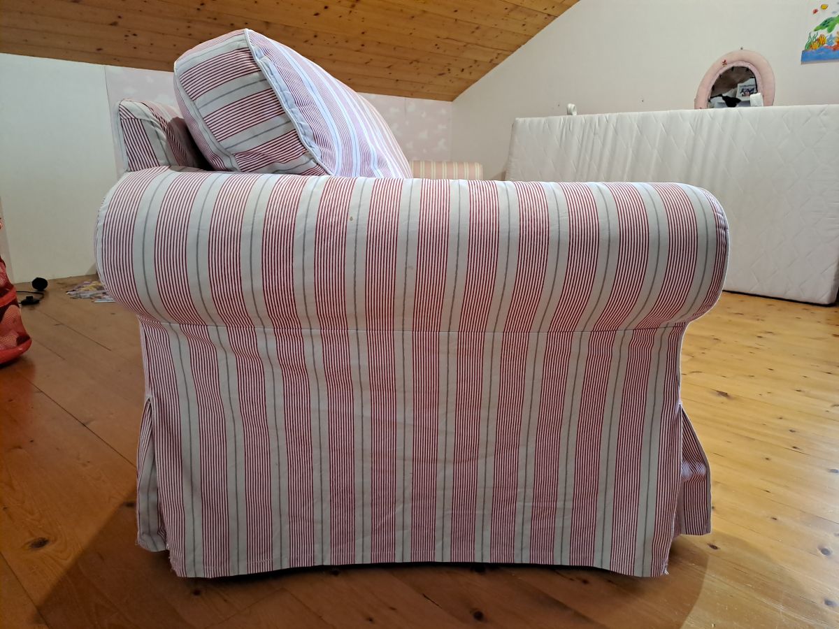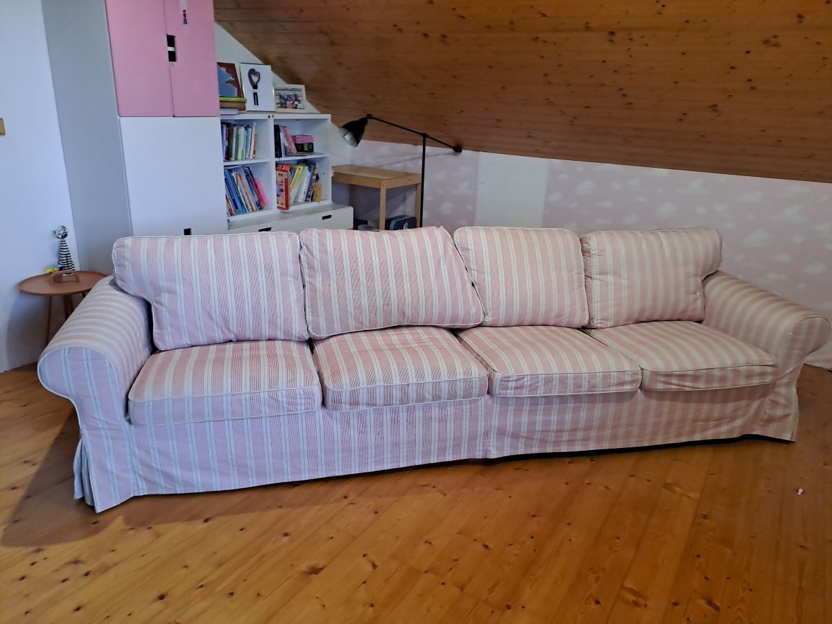 Daruji za odvoz : sedací soupravu IKEA EKTORP, růžová, látkový potah, potahy na zip, lze sundat a vyprat v pračce. Š x V x H: 325 x 85 x 90 cm. Původně rohová, přestavěná na podélnou, čtyřmístnou. Není rozkládací.