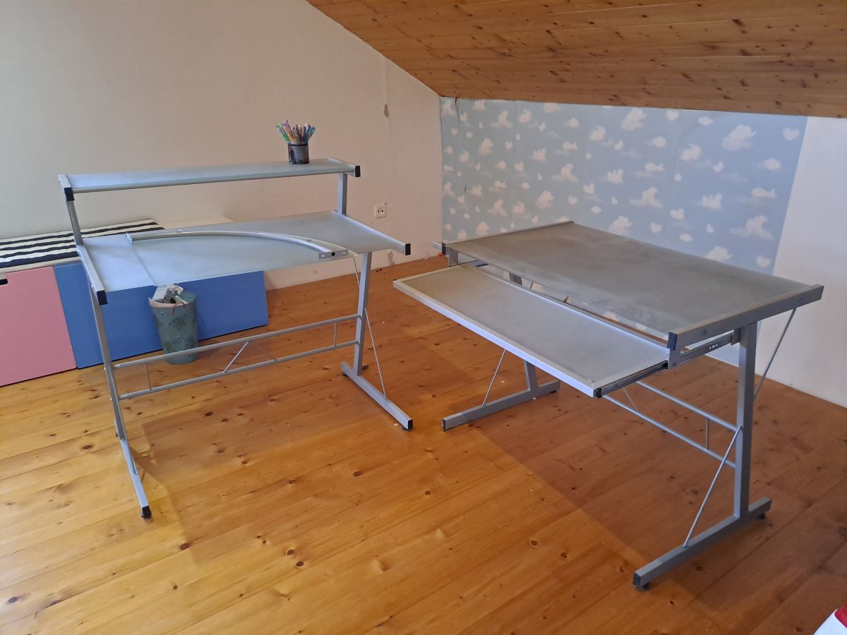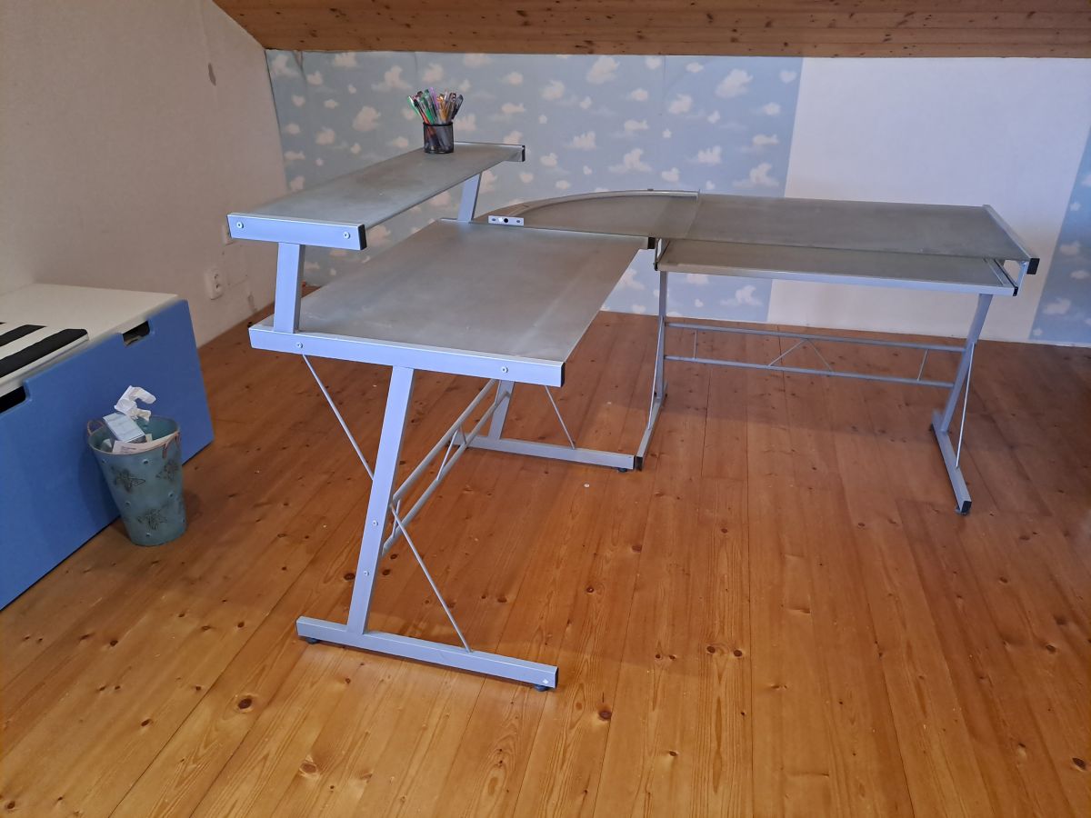 Daruji rohový pracovní stůl, materiál kov + sklo. Lze rozložit na dva samostatné stolky. Jeden na počítač s výsuvným šuplíkem na klávesnici. Druhý stolek s odkládací horní poličkou na drobnosti. Souprava se spojuje "do L" rohovým prvkem. Š x V x H jednotlivých stolků 95 x 75 x 60 cm. Výška k horní poličce 95 cm. Rozměr celé soupravy ve složeném stavu ("do L") 155 x 155 cm.