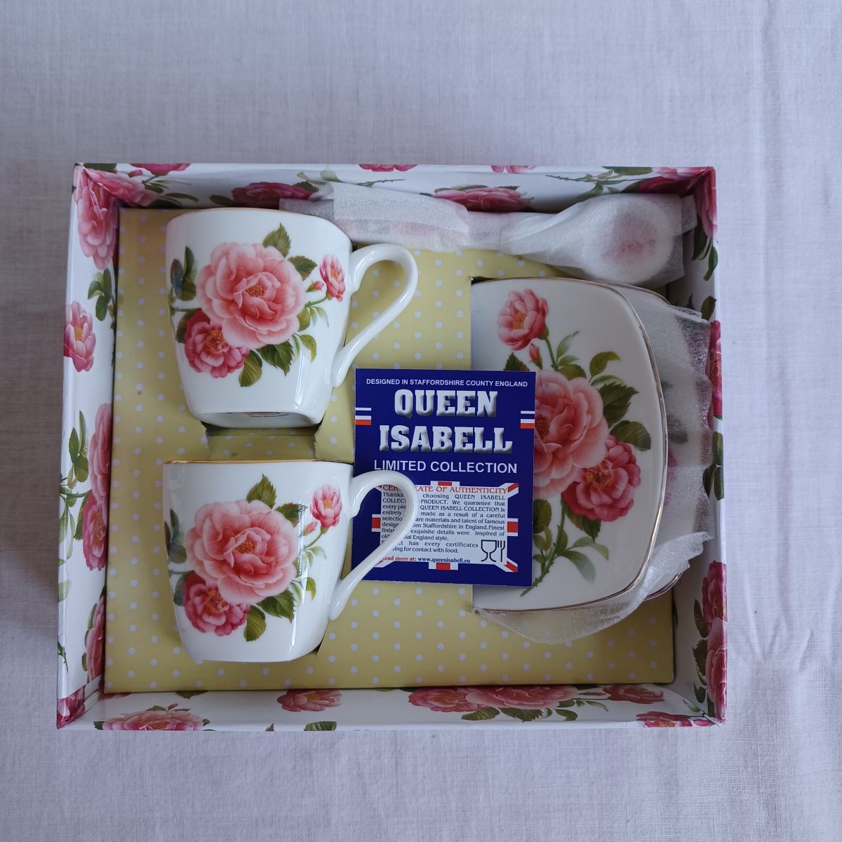 Daruji za odvoz set dvou šálků s podšálky a lžičkami. V bezvadném stavu, nové.