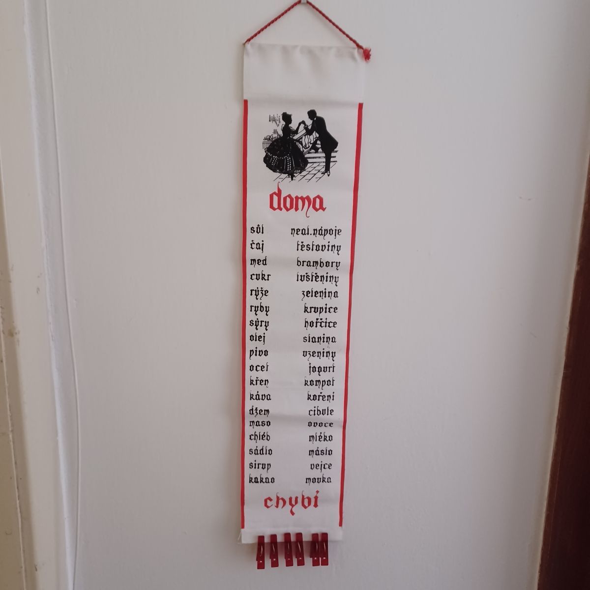 Daruji za odvoz retro nákupní seznam, látka, 6 plastových kolíčků, rozměr 68 x 15 cm.