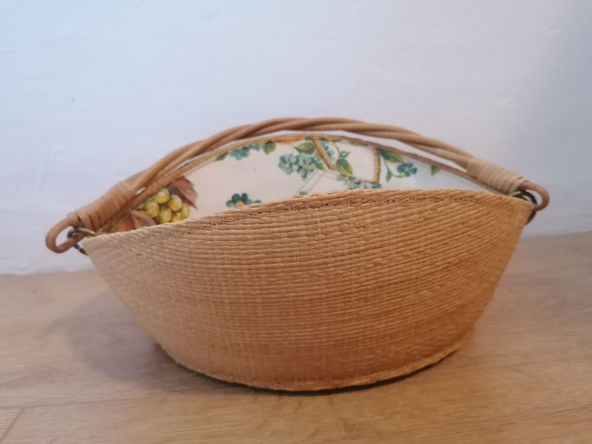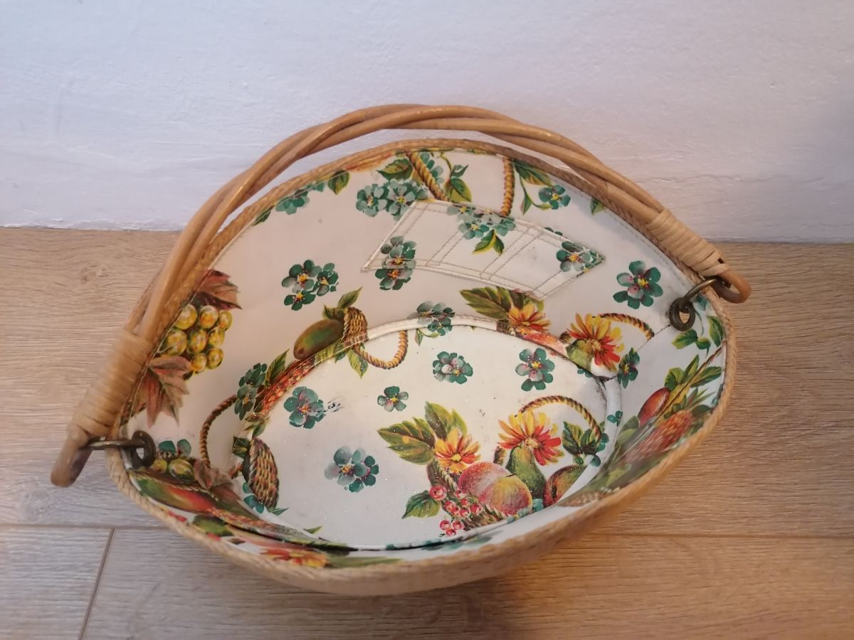 Z venku proutěný, vnítřek s plastovým potahem s kytkovaným-ovocným vzorem. Rozměry: 27 X 11 X 19 cm