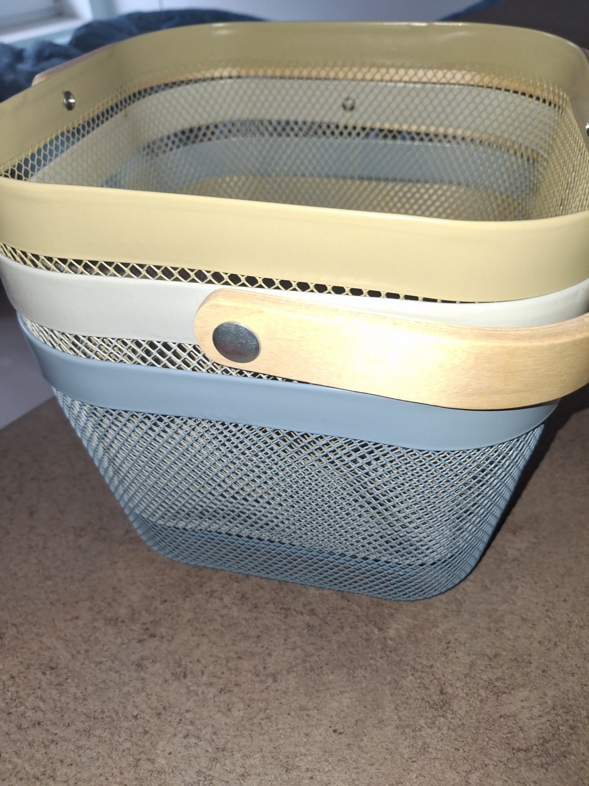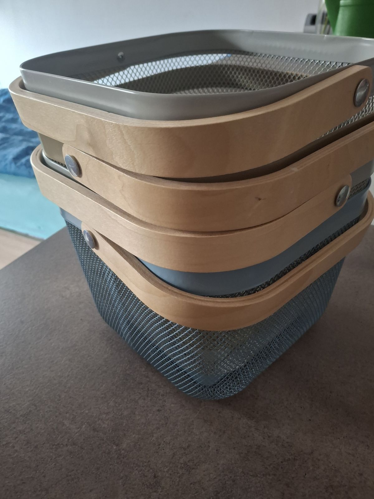 Daruji za odvoz 4 ks košíčků z ikei s dřevěným pohyblivým uchem. Ucha jdou odšroubovat. Barvy - 1x modrá, 1 x khaki, 2 x šedá. Rozměr je na výšku 19 cm a na šířku cca 24-25 cm, záleží jestli měříte část s uchem nebo bez. Osobní odběr v Praze Malešicích.