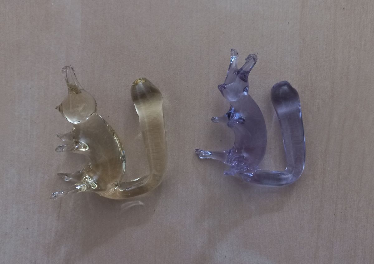 Daruji za odvoz dvě skleněné mini veverky. Výška: 4 cm.