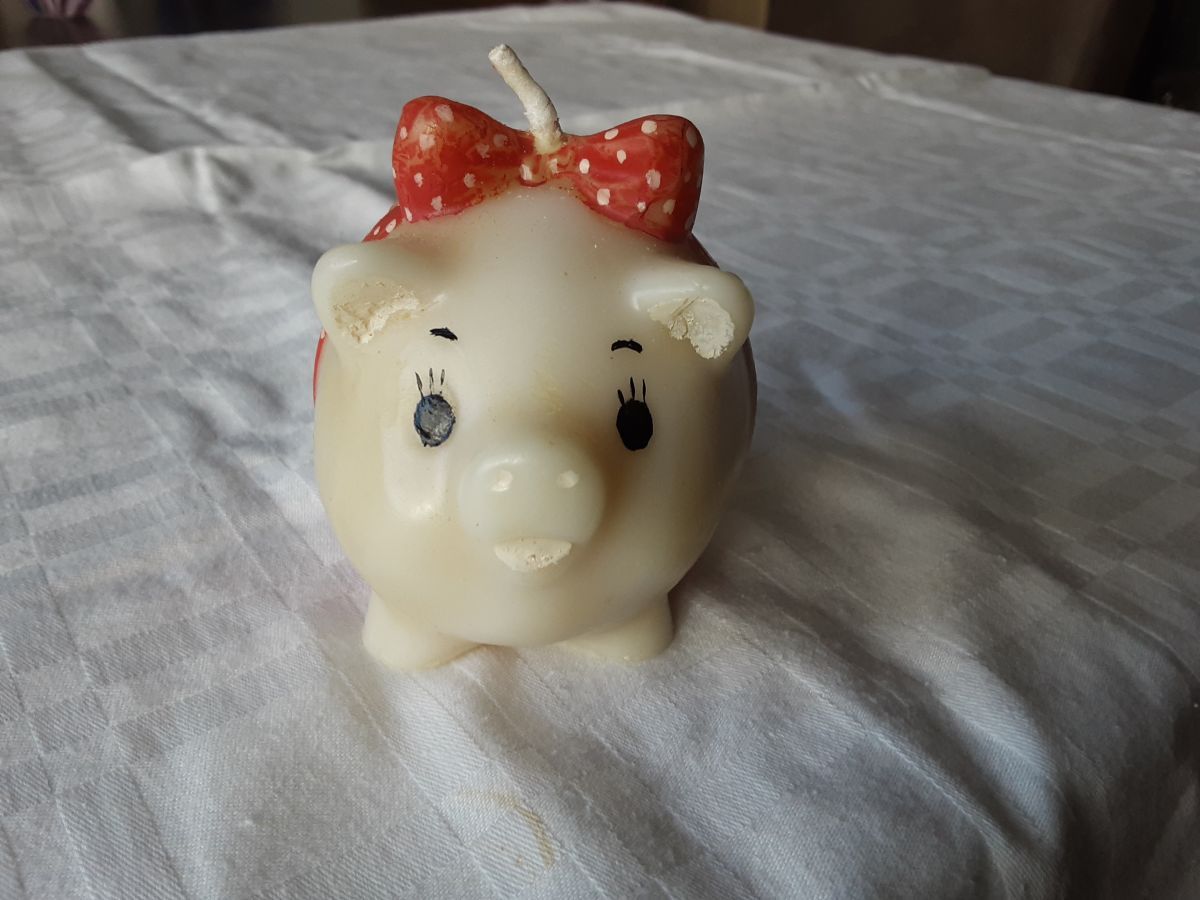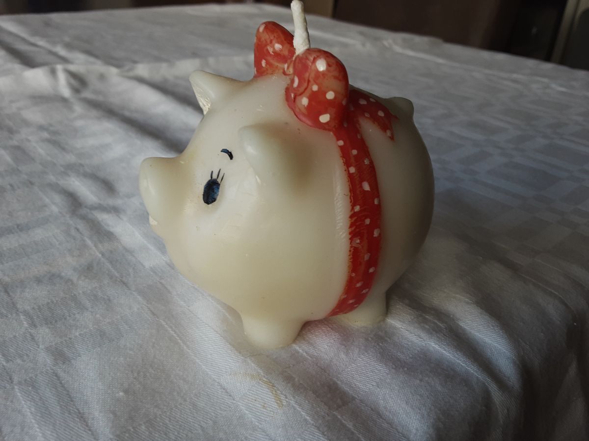 Daruji za odvoz starší svíčku - kulaťoučké prasátko s puntíkovanou mašlí, 8 cm.