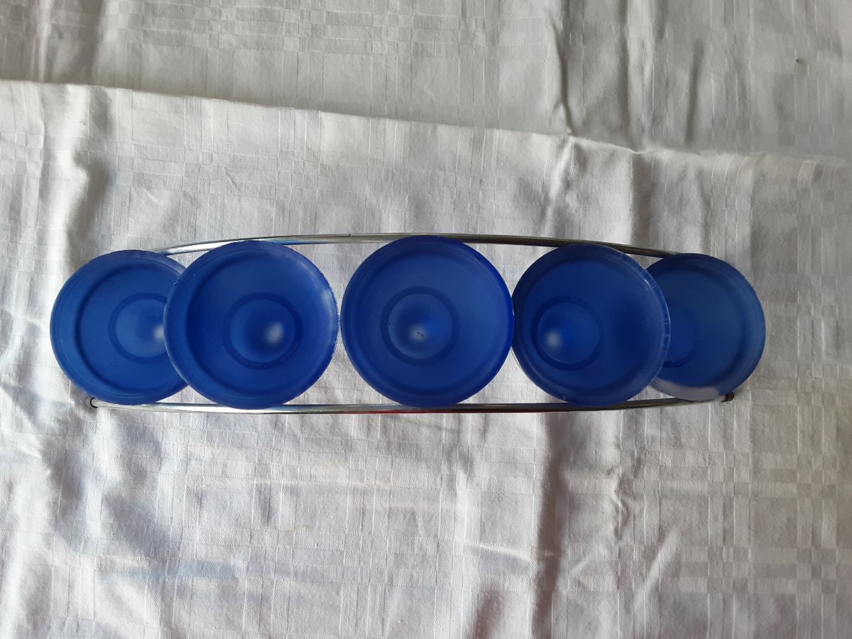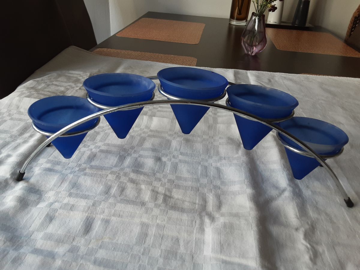 Daruji za odvoz starší svícen na čajové svíčky, 40 cm délka. Kov + modré skleněné kužely, na jednom je nahoře trochu odřená barva. Zapálený ale vypadá skvéle.