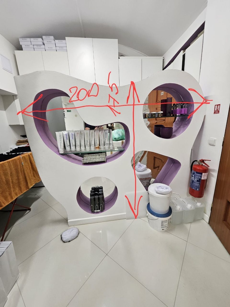 skříňka/ zíďka/ příčka se zrcadly připevněna lepidlem ( budete muset odříznout ) z pynoplastu pokryta perličkou a lepidlem. je těžší budete potřebovat víc než 1 člověka