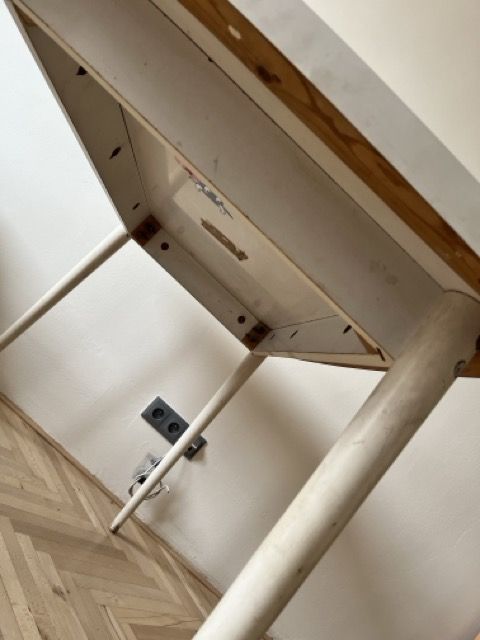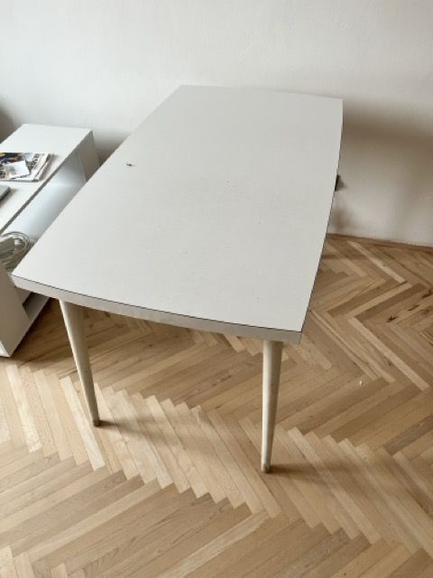 Daruji za odvoz bílý stůl. Poměrně masivní a stabilní, lze využít někde v dílně jako pracovní. Okraje mírně zaoblené.