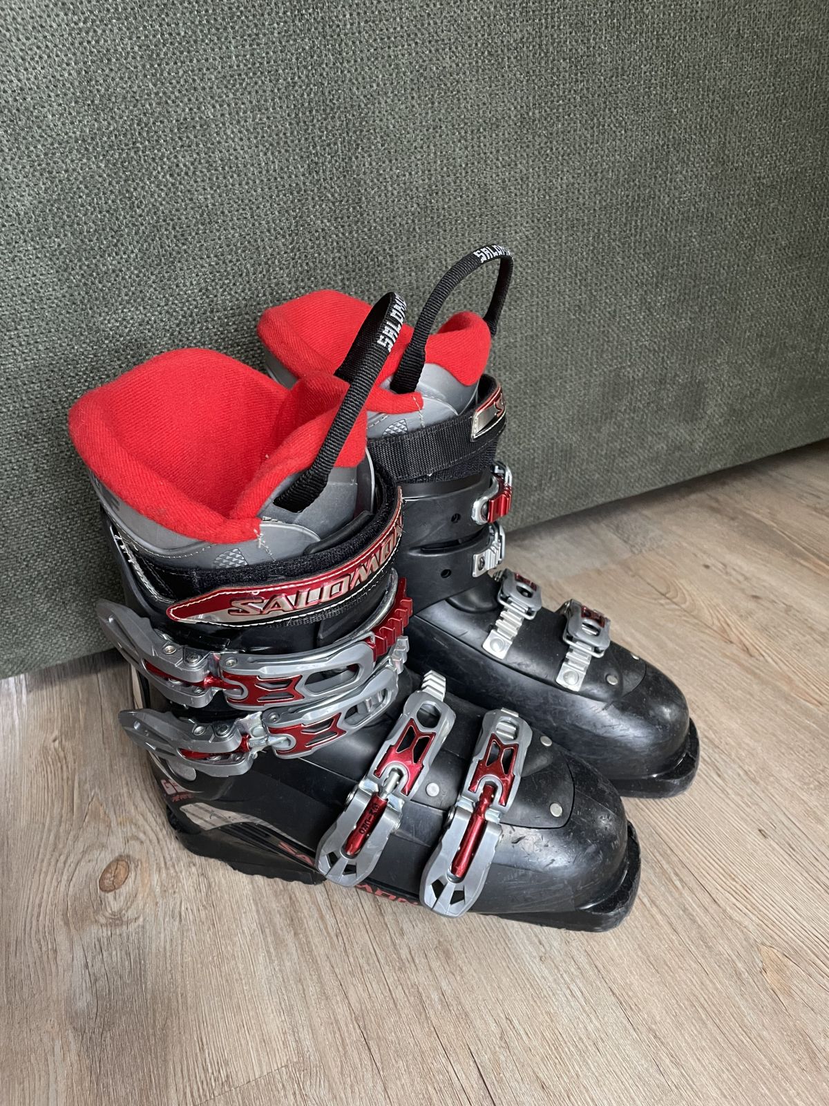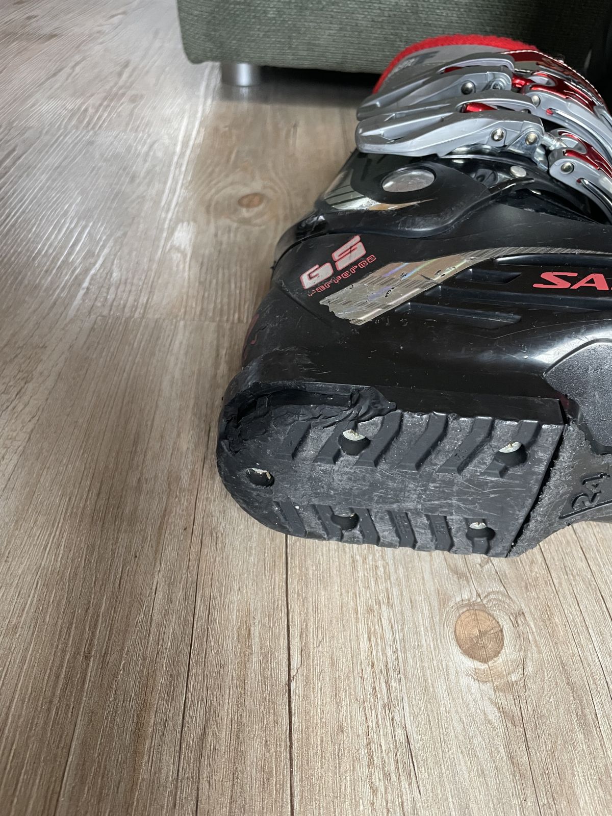 Daruji za odvoz lyžáky Salomon vel.38 (24-24,5). Na patě jedné boty se při chůzi ulomil kousek spodního materiálu. Ve vázání ale drží pevně a nemá na nic vliv.