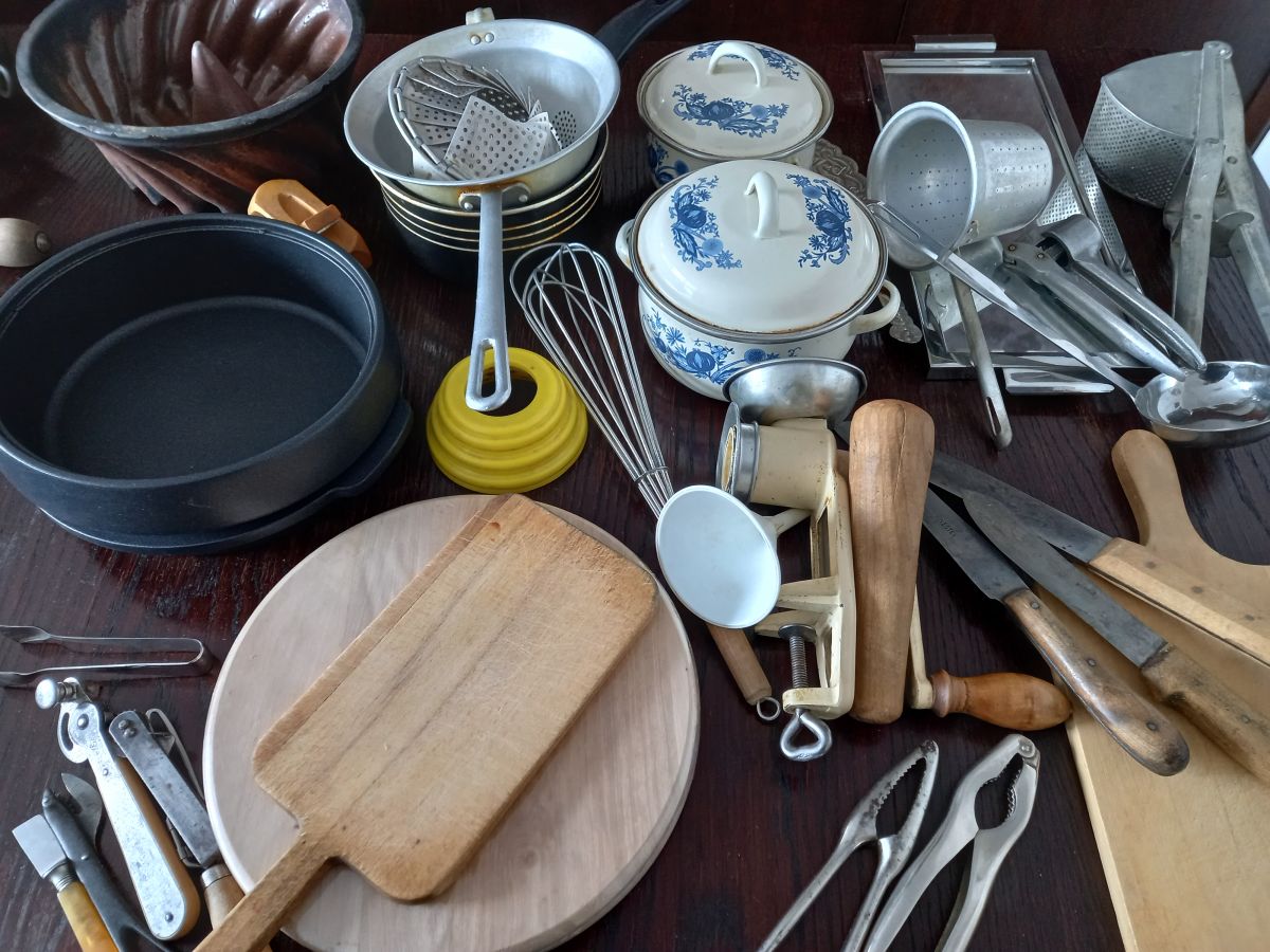 Daruji věci do kuchyně: nože, prkýnka, hrnce, pánve a jiné. Vše sbaleno v jedné krabici od banánů.