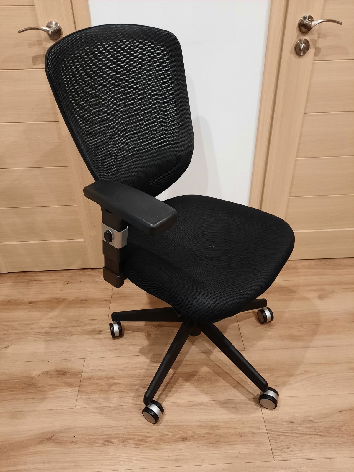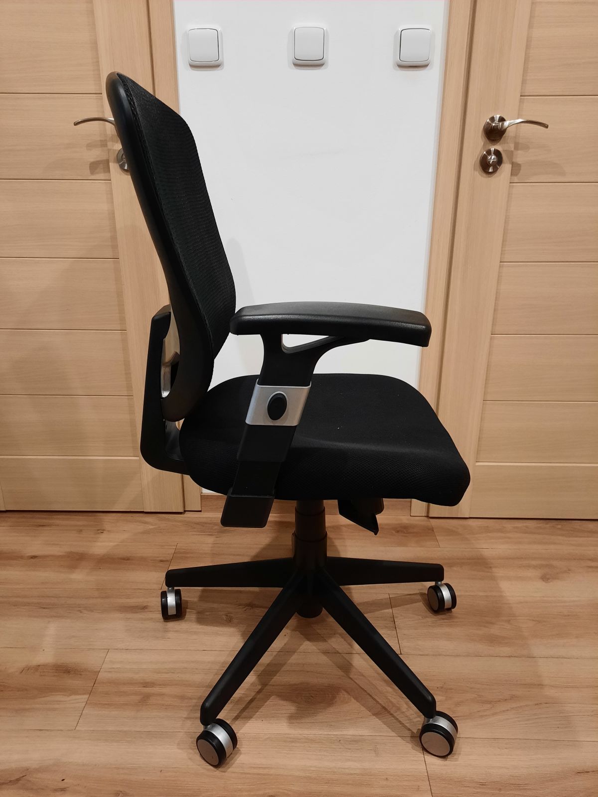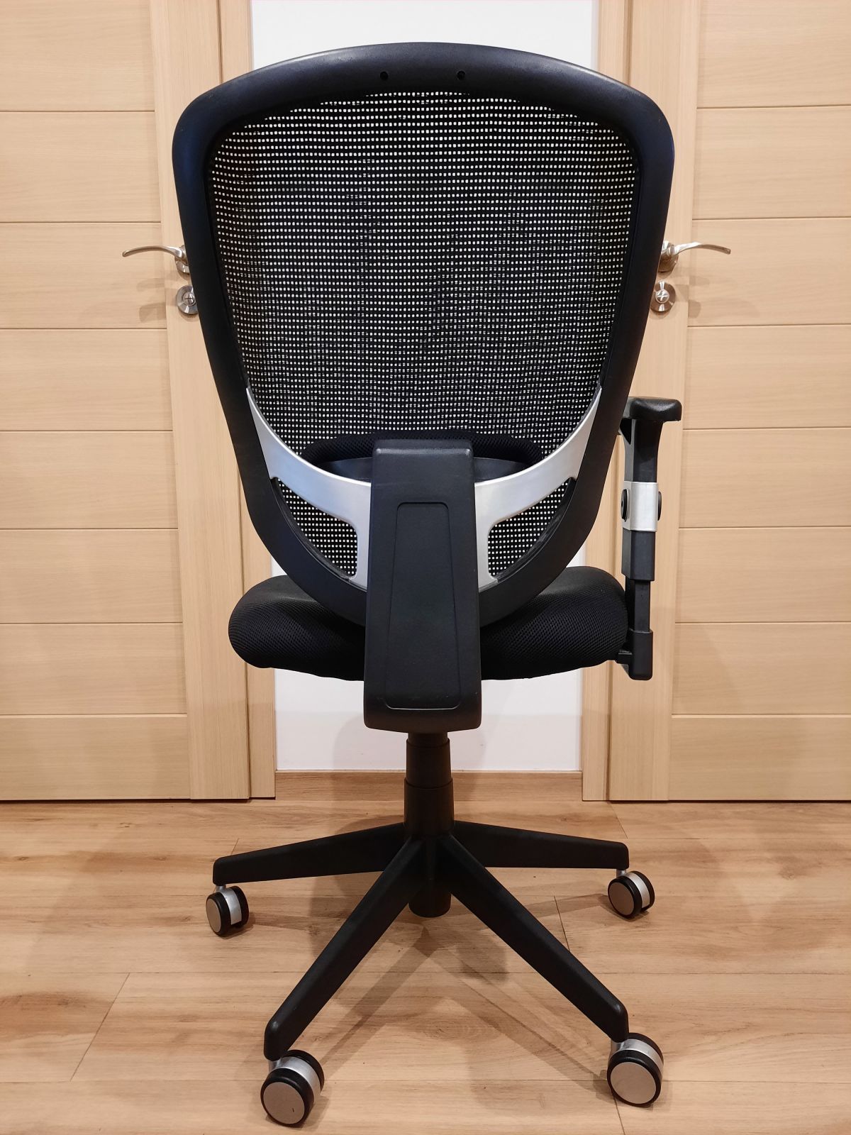 Daruji za odvoz černou kancelářskou židli s látkovým potahem a síťovanými zády. Má pouze jednu opěrku, sedák je poněkud prosezený. Kolečka a polohovací mechanismus plně funkční.