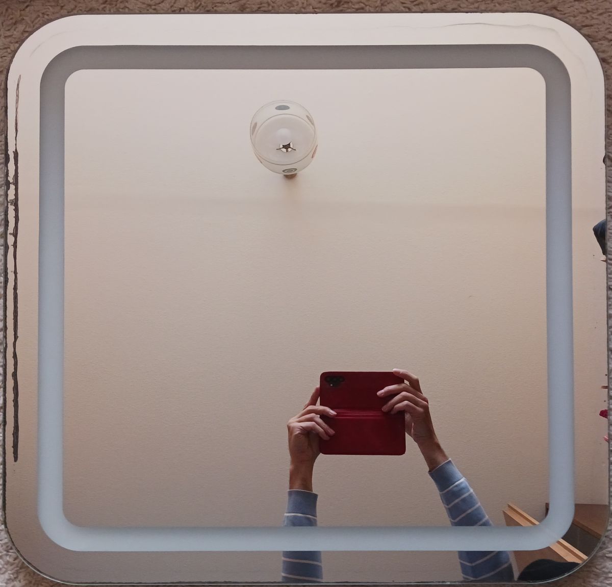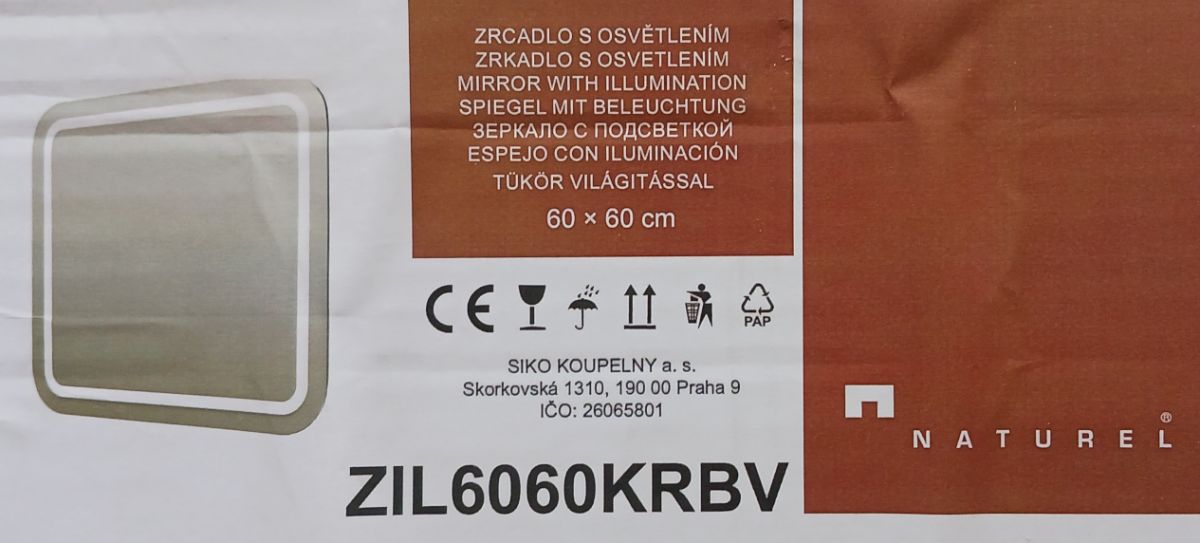 Zrcadlo s osvětlením 60 x 60 cm. Osvětlení funguje, ale okraje zrcadla jsou "osleplé" (oloupalo se pokovení/odrazová vrstva).