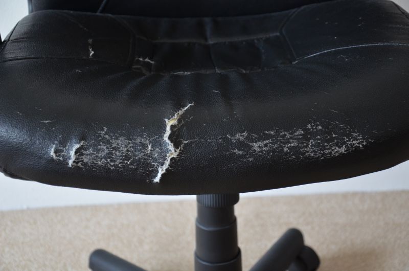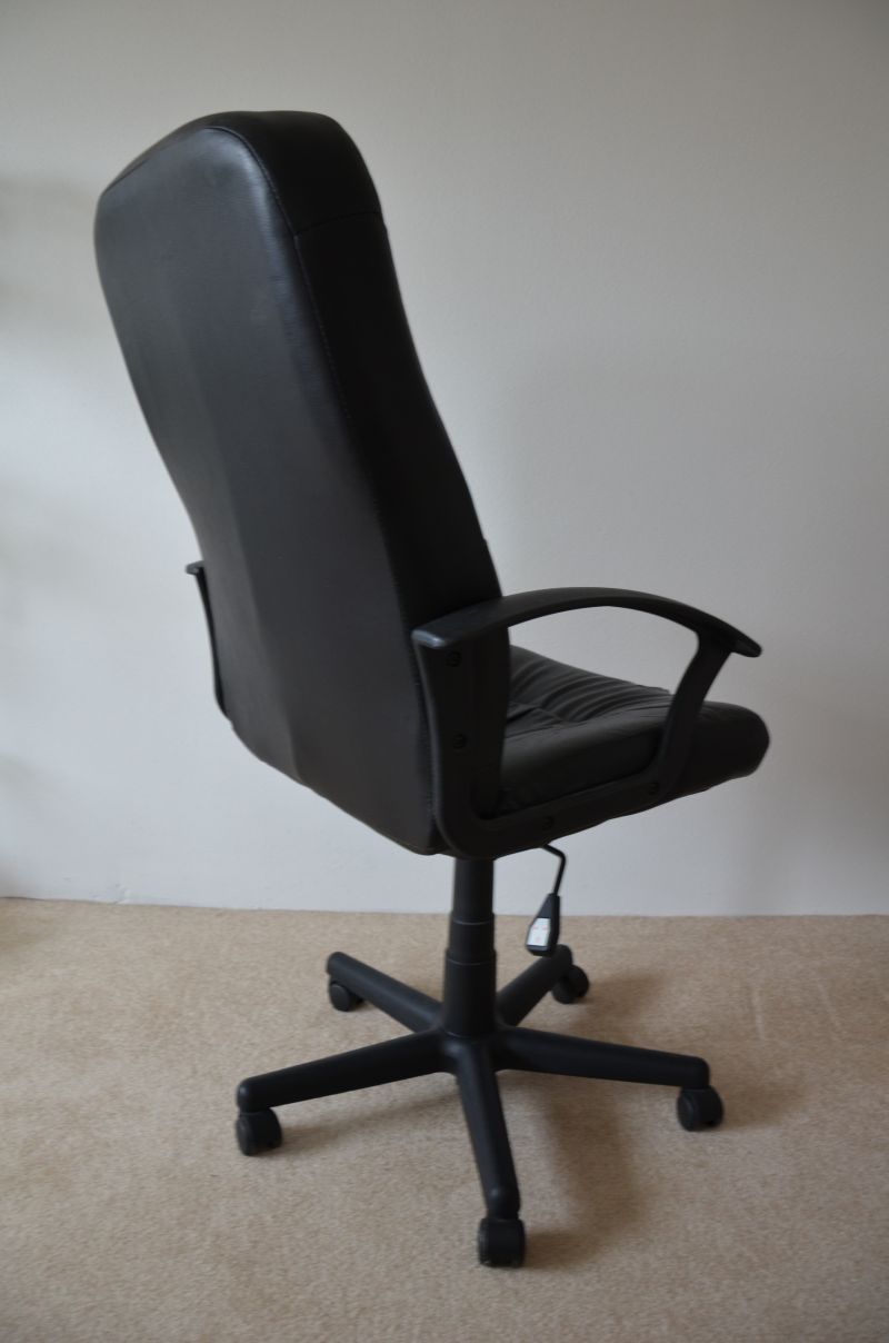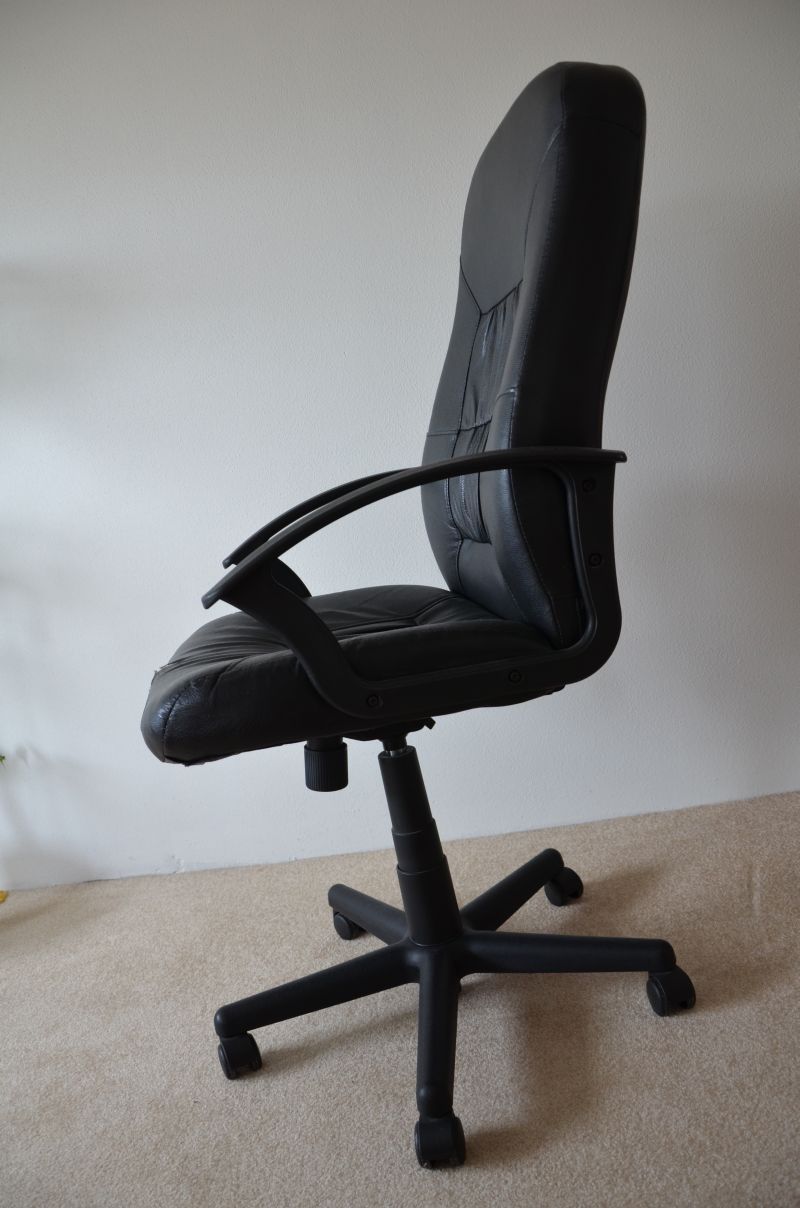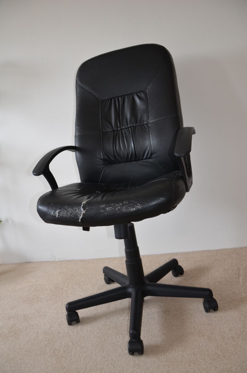 Robustnější koženkové křeslo na kolečkách, poškozený sedák. K vyzvednutí v Plzni