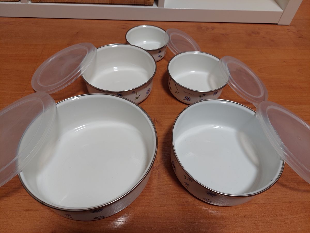 Daruji za odvoz sadu 5 ks smaltovaných nádob Reoona s plastovými víčky. Nepoužívané. Průměr největší nádoby 17 cm, nejmenší 9 cm. Víčko té největší je zvenku lehce poškrábané - viz poslední foto. Ostatní super stav.