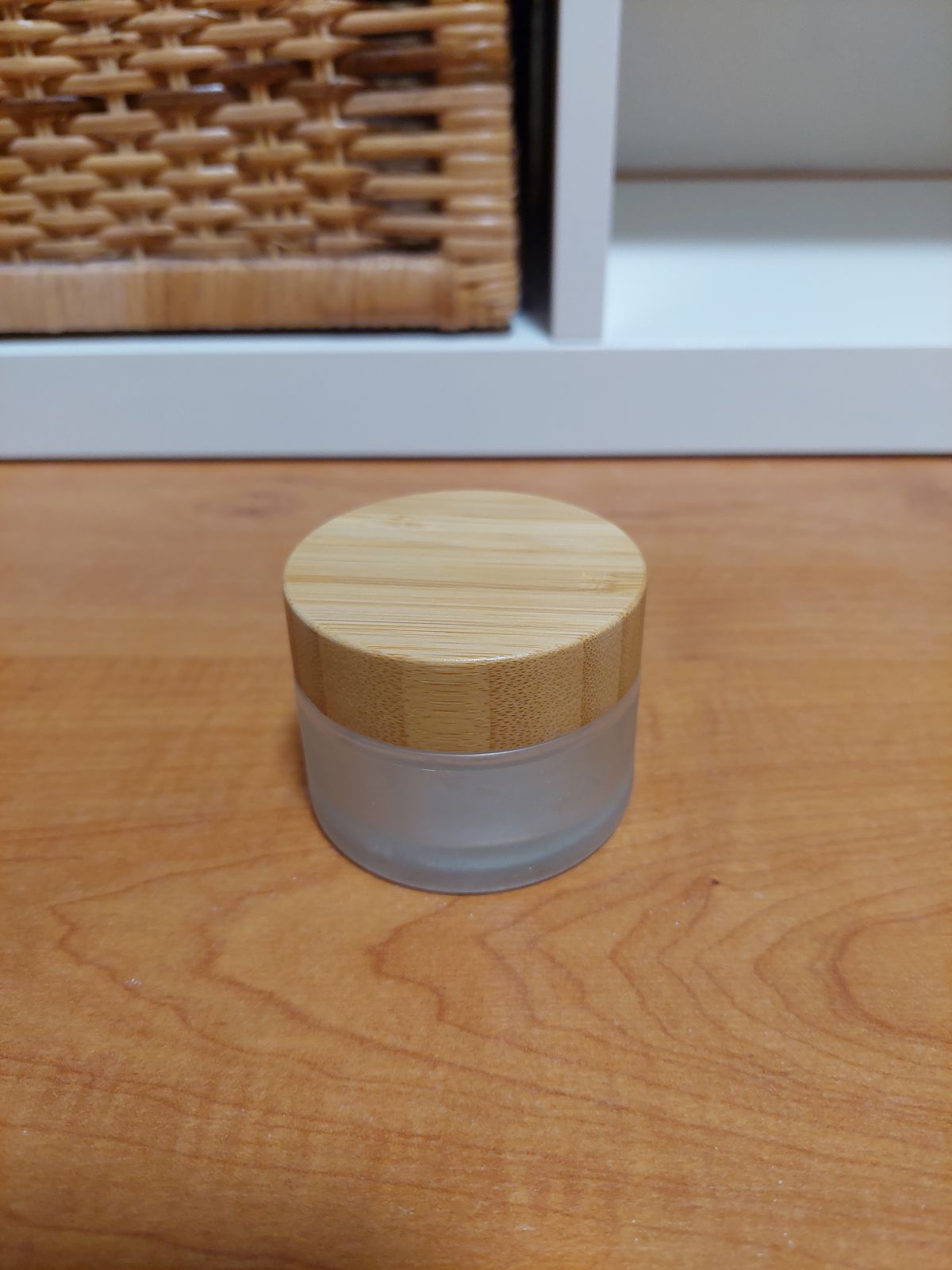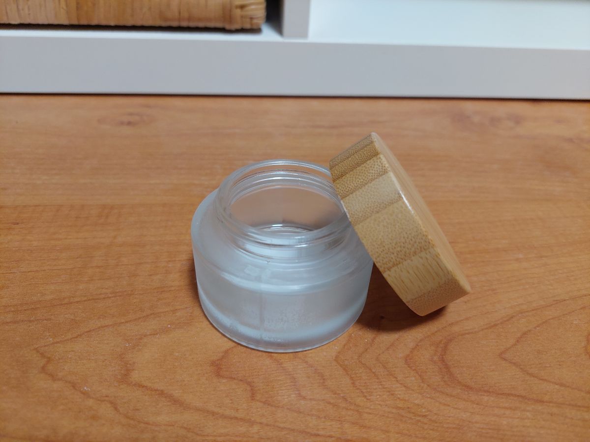 Daruji za odvoz skleněnou nádobku s bambusovým víčkem 50 ml, od krému (krém byl v plastovém vnitřním obalu, takže sklo není ulepené).