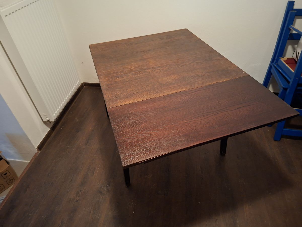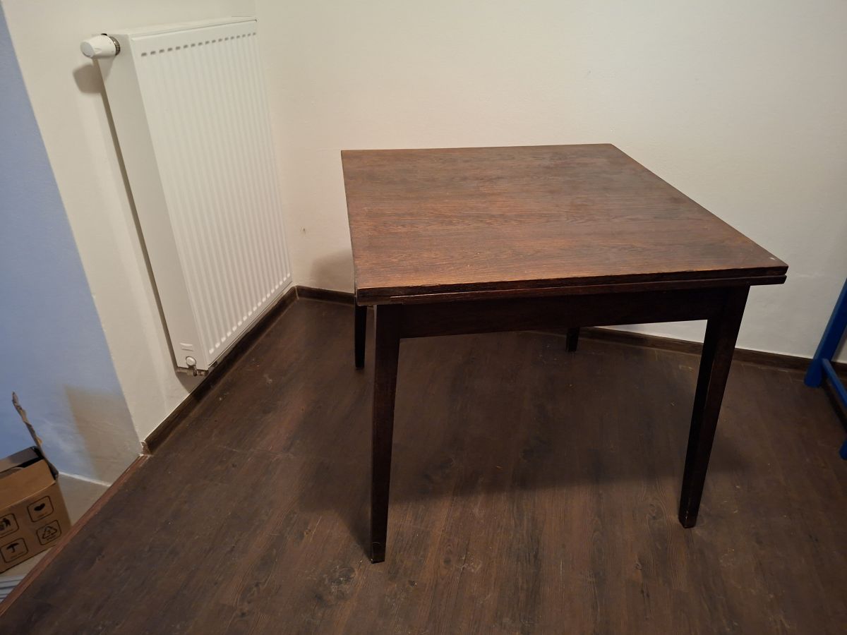 Rozmer cca 85x85x76v, po rozlozeni dvojnasobna delka desky ( na fotce vysunuta kvuli mistu jen jedna rosirovaci deska. Pokud nekdo ale chce rozsirovat musi se vysouonout obe rozsireni, jinak by deska nebyla rovna). Na transport se da rozlozit na konstrukci a deska stolu na jednotlive desky.