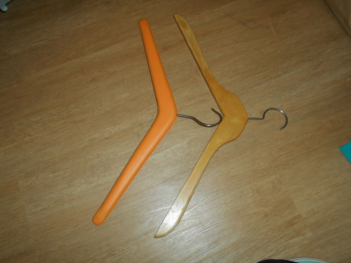 1 koženkové a jedno dřevěné šatní ramínko