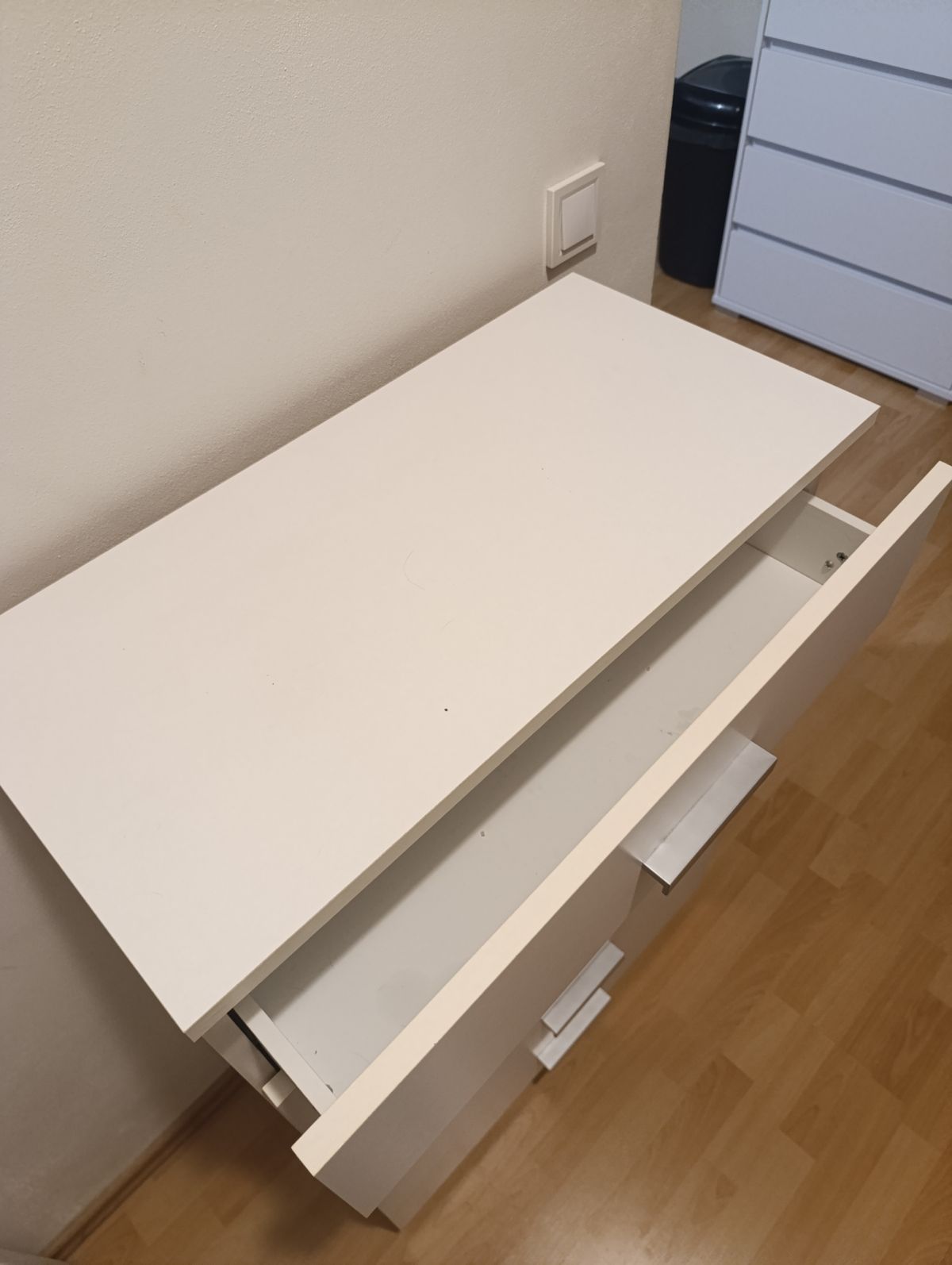 Daruji za odvoz bílou šuplíkovou komodu o rozměrech 70 x 110 x 35 cm. Komoda je vzhledově v pořádku, ale má opotřebovaná ložiska u pojezdů, takže šuplíky při otevírání a zavírání drhnou a jdou ztuha.
