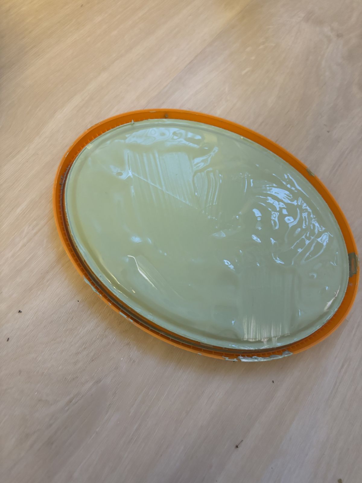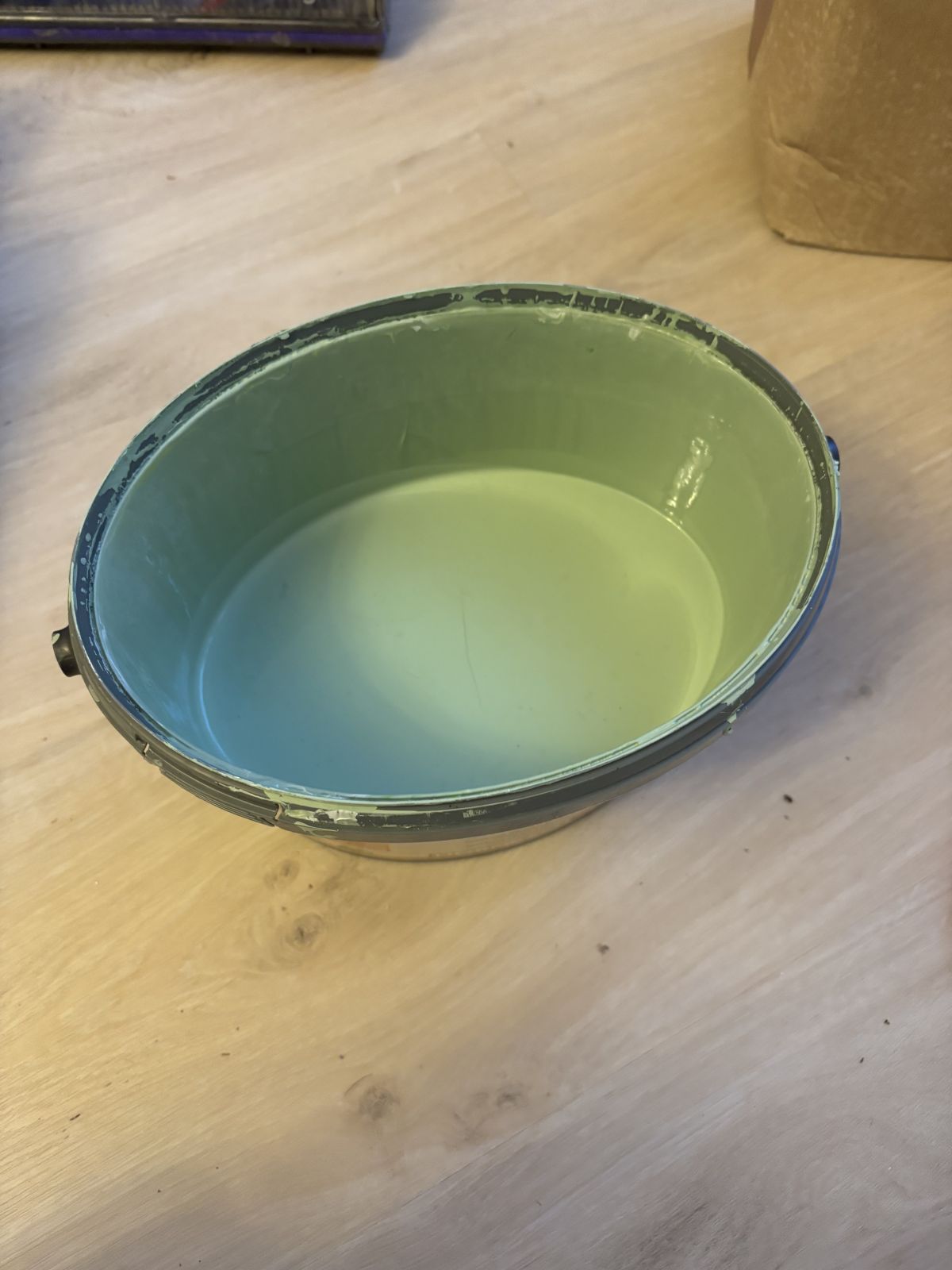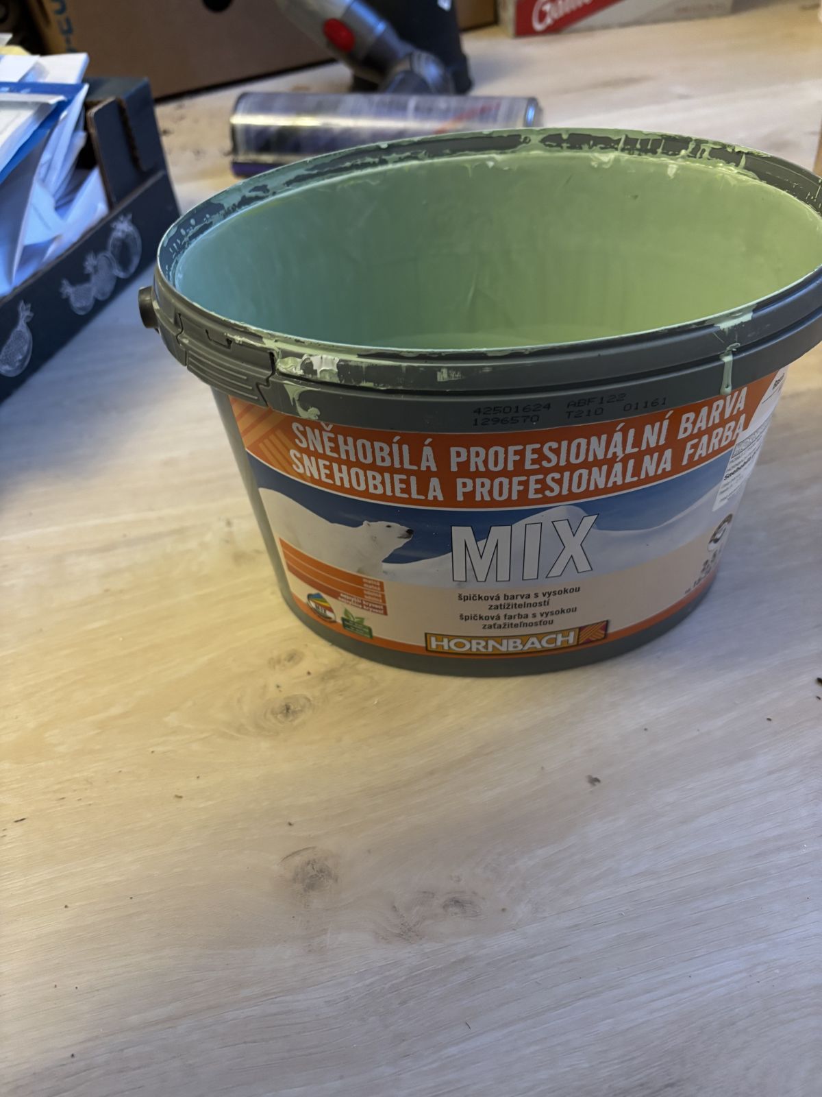 Cca 1 litr světle zelenkavá interiérové barvy. Původně byly barvy 2,5 l.