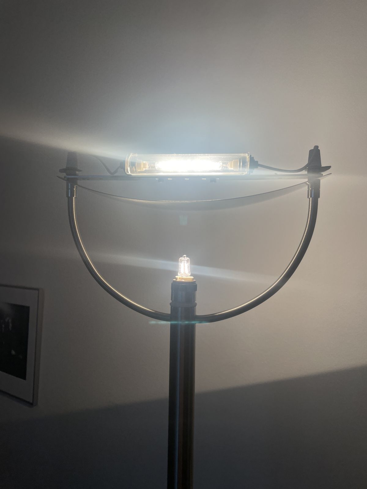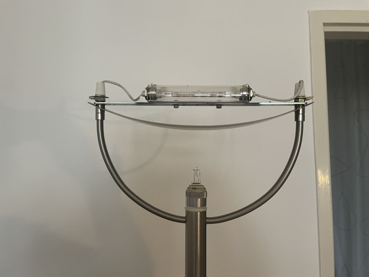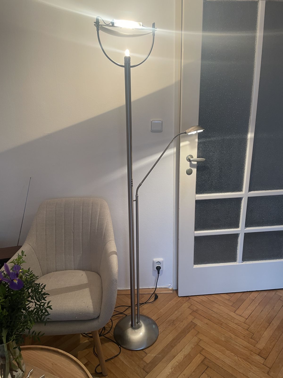 Daruji za odvoz stojací lampu. Má stříbrnou kovovou konstrukci, vysoká 185 cm se třemi zářivkami - otočná čtecí na ramínku a dvě horní. Stmívatelna, plně funkční se známkami běžného opotřebení.