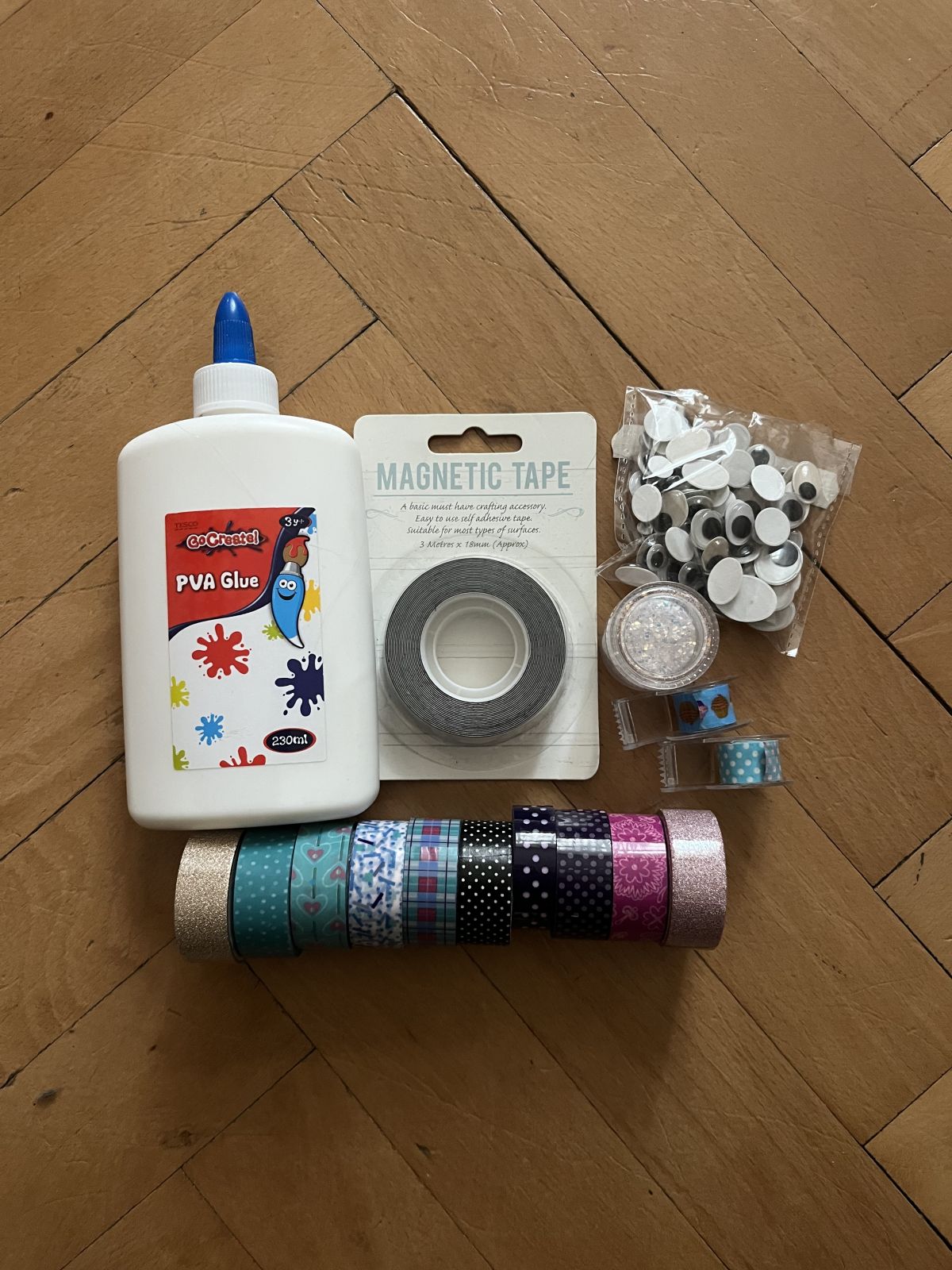 Daruji za odvoz věci na tvoření - otevřené, ale stále funkční lepidlo, neotevřenou magnetickou pásku, nalepovací očíčka a různé druhy washi pásek a lepenek
