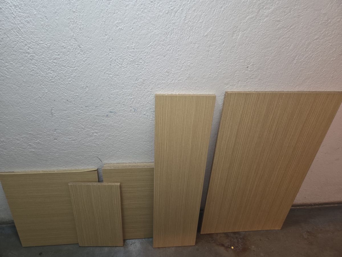 Dřevěné desky, police, myslím, že jsou z toho Universal nábytku. Byly uschované ve sklepě.
