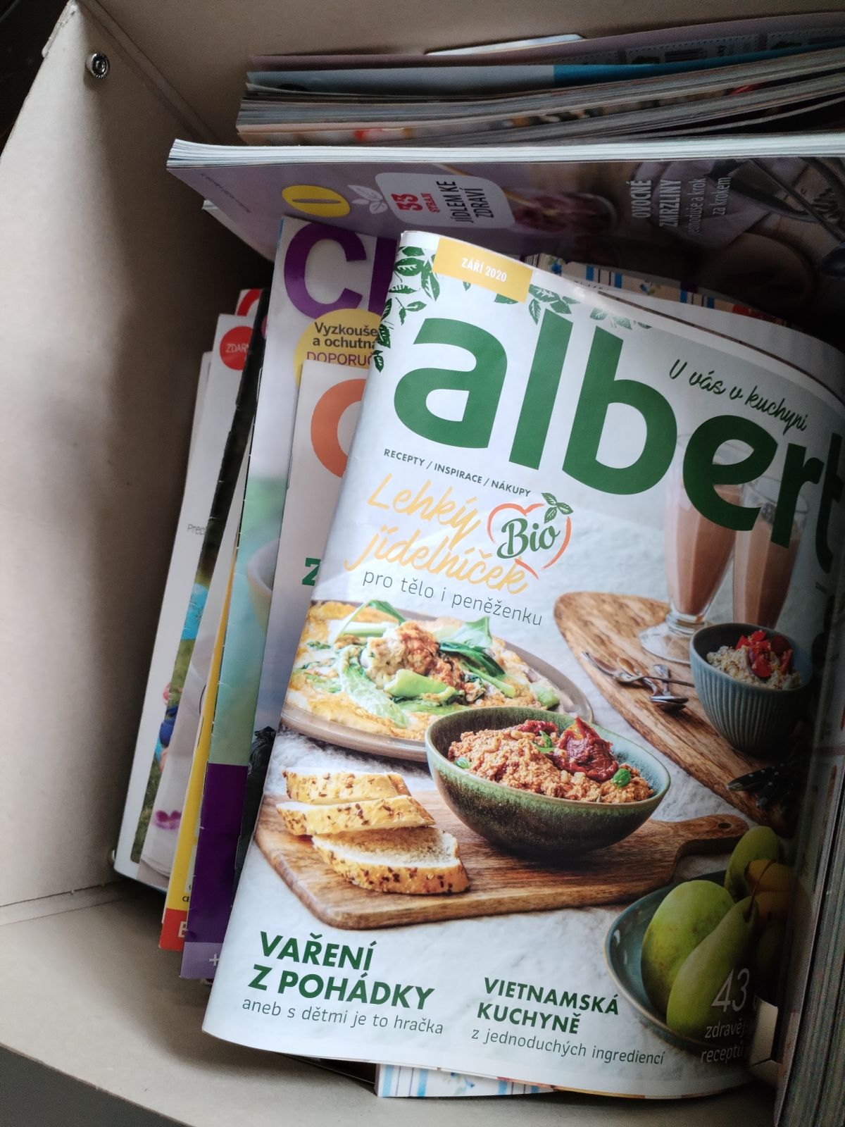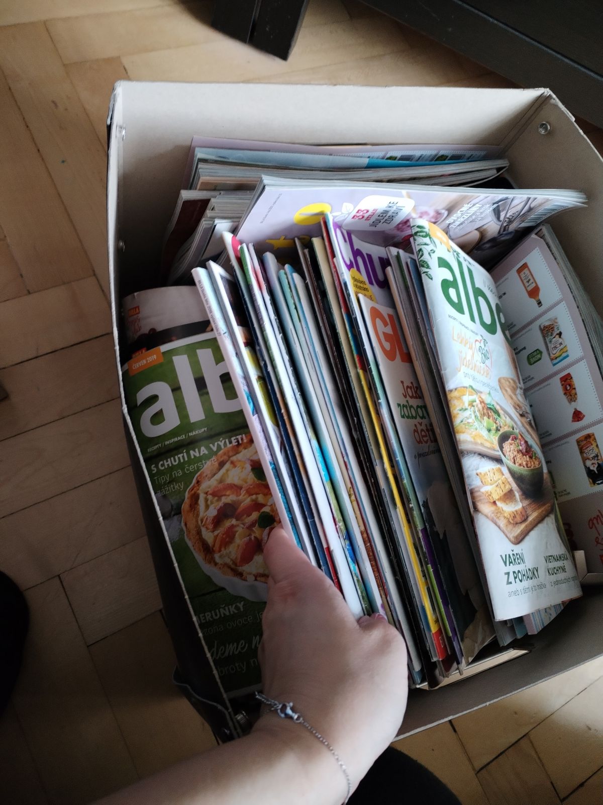 Dobrý den, daruji za odvoz plnou krabici s časopisy o vaření.