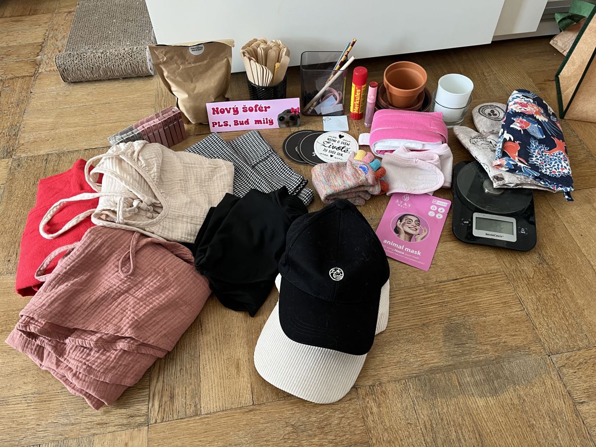 Obsahuje např. dámské oblečení vel.40 (dlouhé šaty, krátké šaty, tričko s krátkým rukávem, overal, sukni), kuchyňskou váhu, substrát na sukulenty, čelenku, obklad na krk, zbytek viz foto.