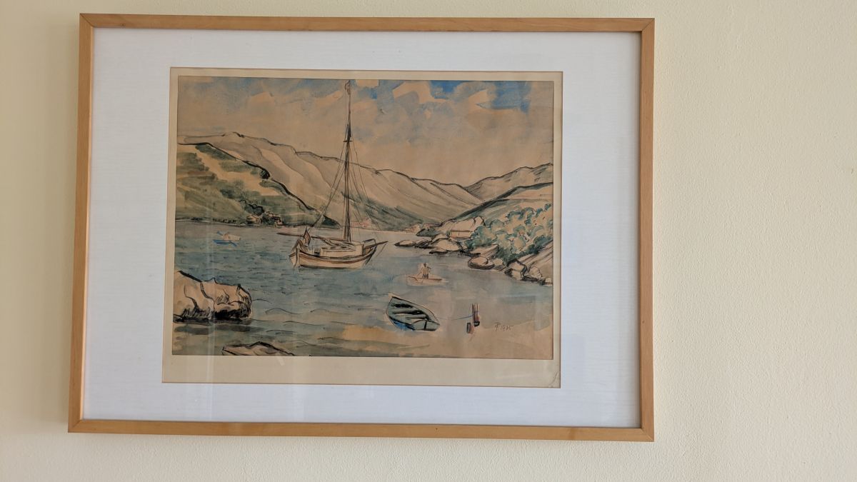 Daruji za odvoz hezký akvarel s plachetnici ve skalnaté zátoce u Středozemního moře. Signováno R 1935. Rozměry včetně rámu 73 x 53 cm.
