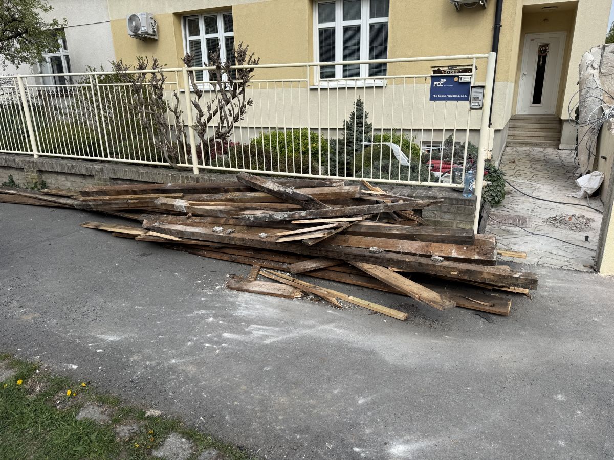 Daruji za odvoz palivové dřevo. Suché prkna a trámy 10/10. Uloženo na chodníku Vršní 32, Kobylisy,Praha 8. Kdo dřív přijde...