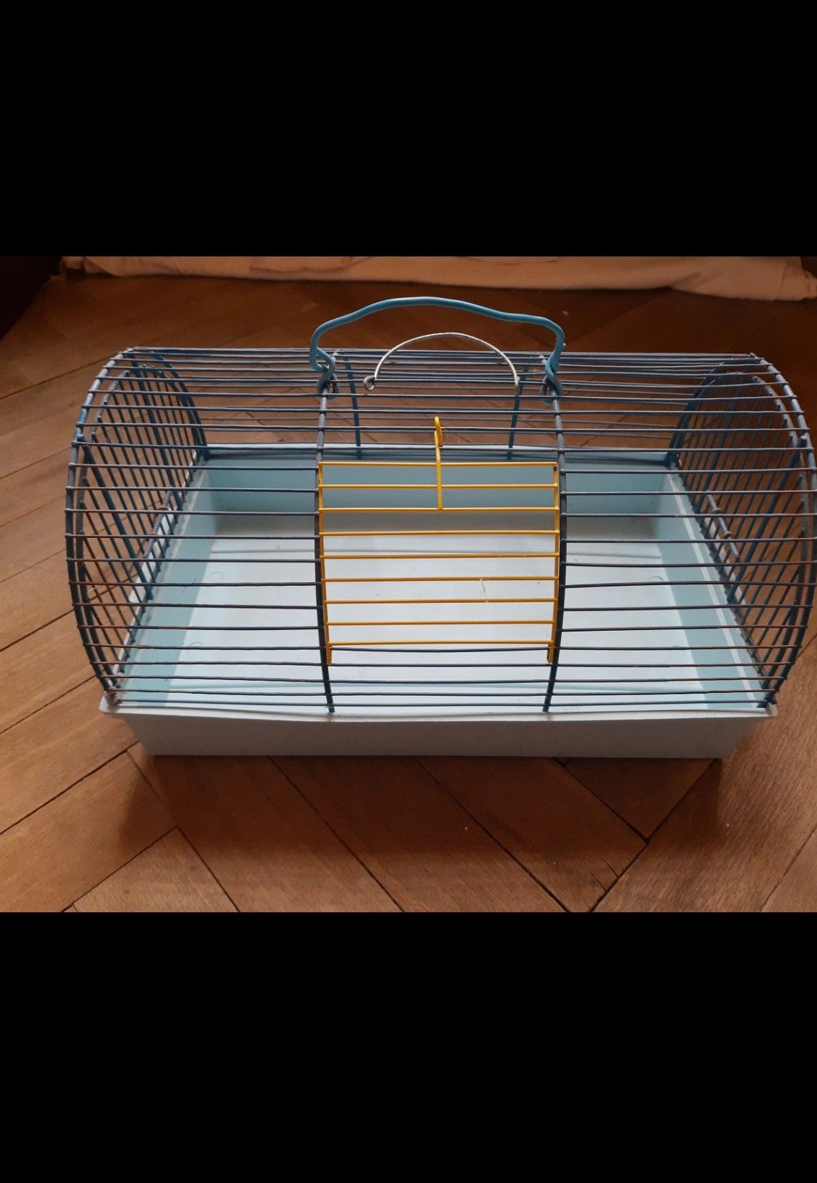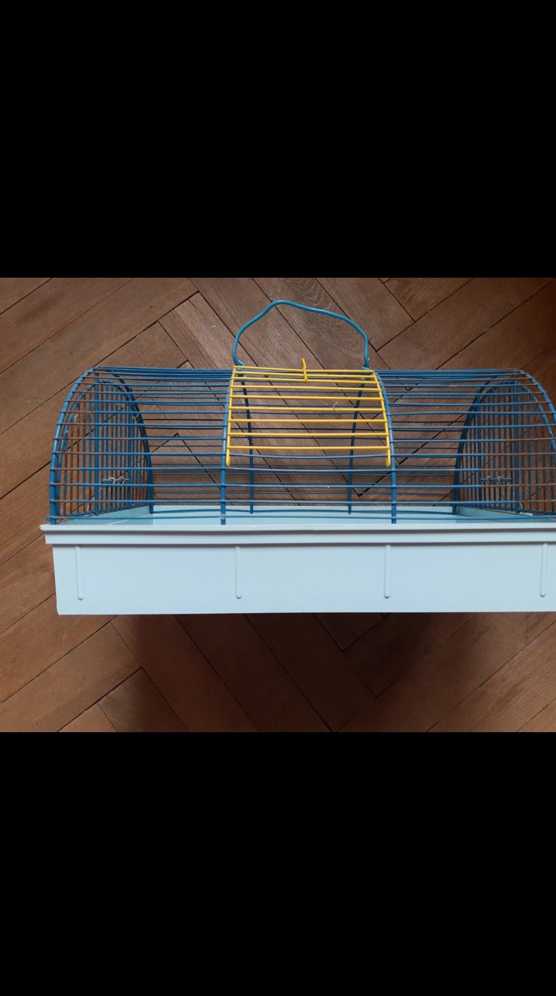 Daruji za odvoz zachovalou klec na malé zvíře. Horní kovovou část lze sundat. Kombinace plast/kov. Rozměry: délka 37 cm, šířka 23 cm, výška modré plastové části klece je 6,5 cm, výška celkem v nejvyšší části klece 20 cm. Kovová část je na některých místech oloupaná.