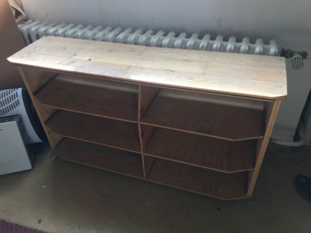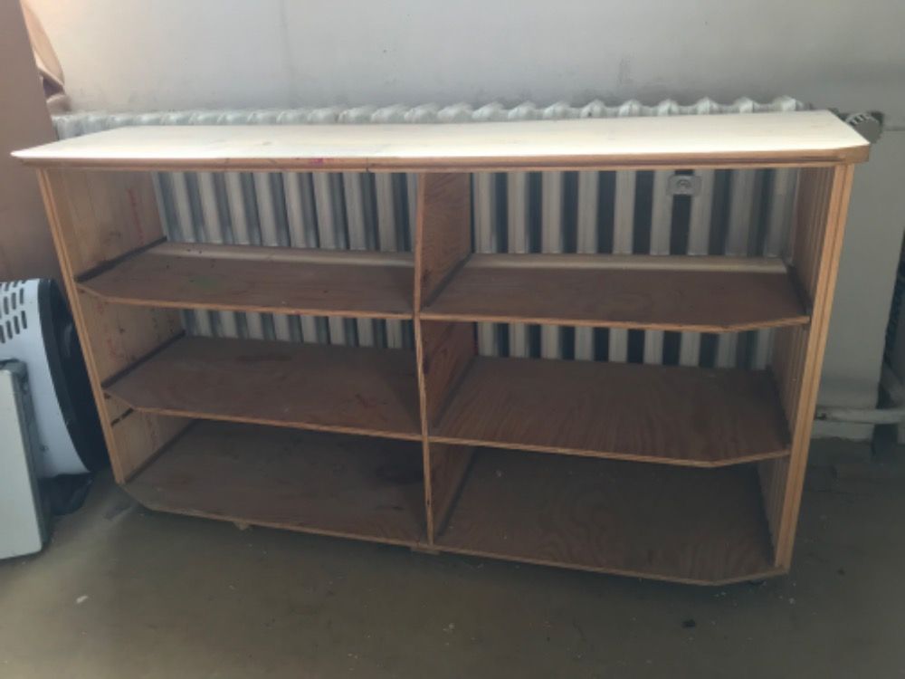 Daruji za odvoz knihovnicku / regalek z vytvarneho atelieru z masivniho dreva s kolecky,- pojizdne. Povrch je trochu vesely a barevne flekaty, coz lze brat jako vyhodu nebo snadno presmirkovat.