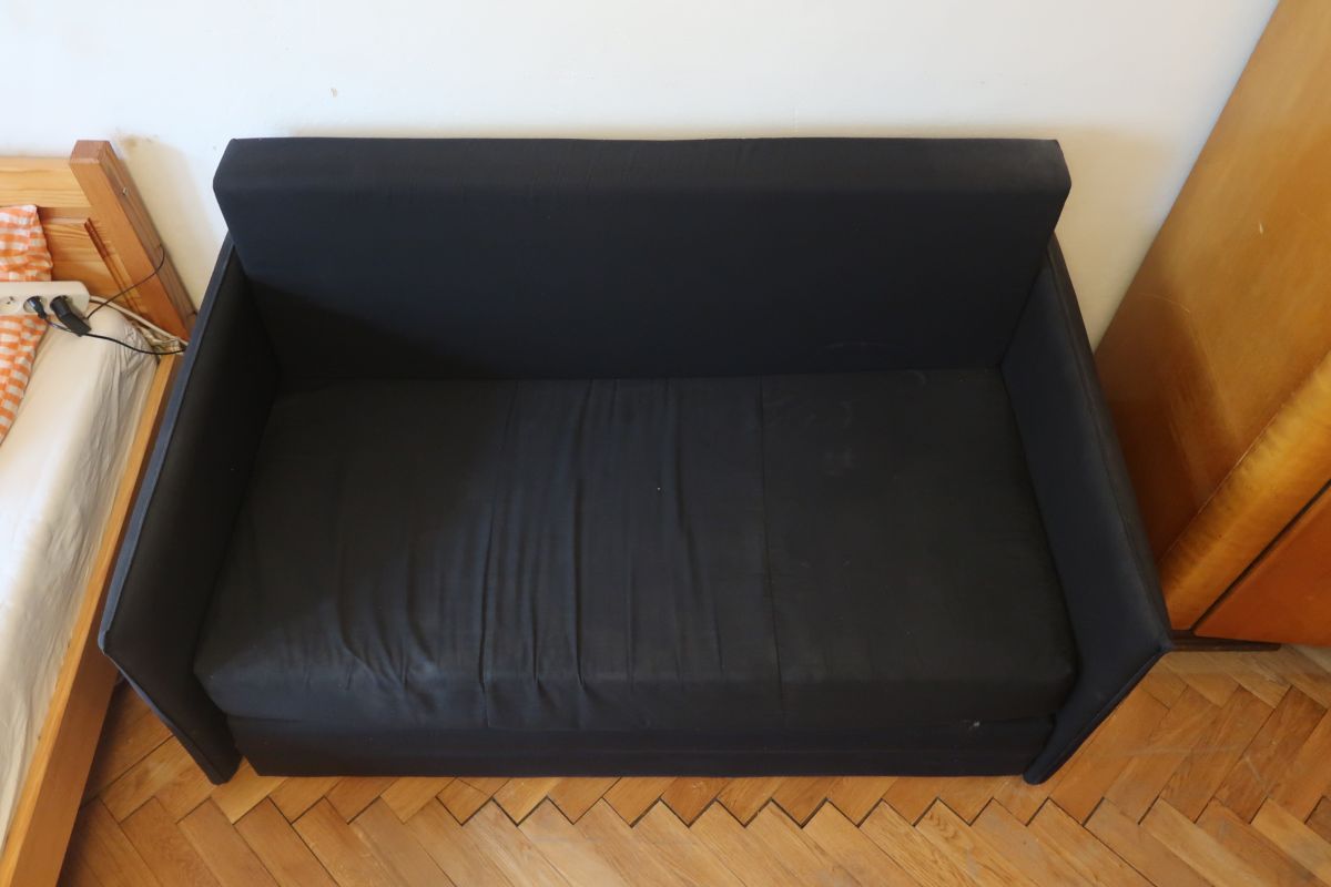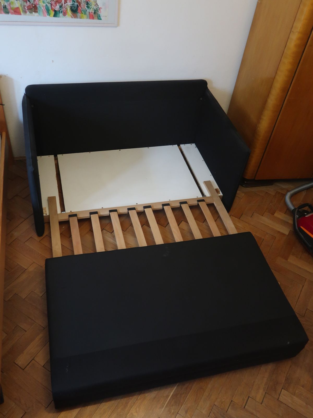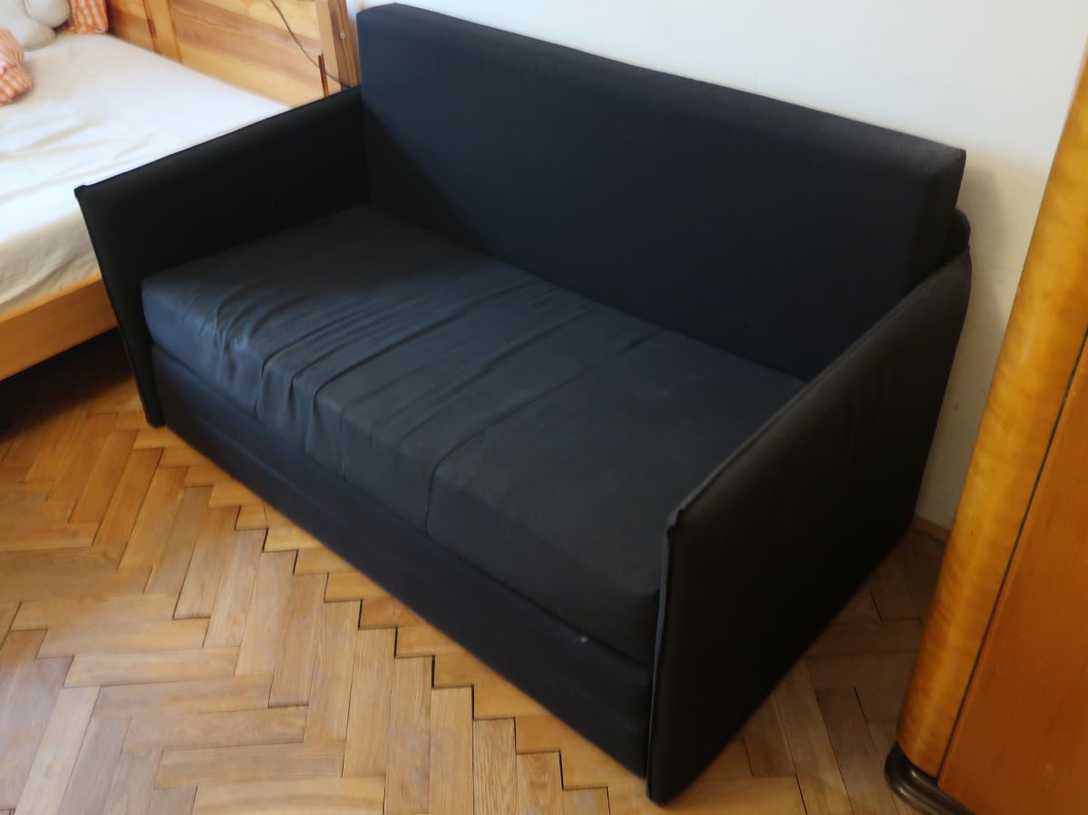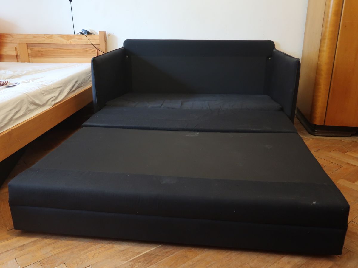 Za odvoz nabízím černou rozkládací pohovku. Sloužila nám léta a je to na ní znát, chceme ji nicméně vyměnit za větší. Prosezená není, v rozloženém stavu se na ní v pohodě vyspí i dvě postavy. Levá stranice je trochu uvolněná, chtělo by ji přišroubovat, na pevnost to však nemá vliv, jen se hůř transportuje. Rozměry š: 133 cm; v: sedáku (ve složeném stavu) 40 cm; h: sedáku (ve složeném stavu) 68 cm; d: rozloženého lůžka 200 cm