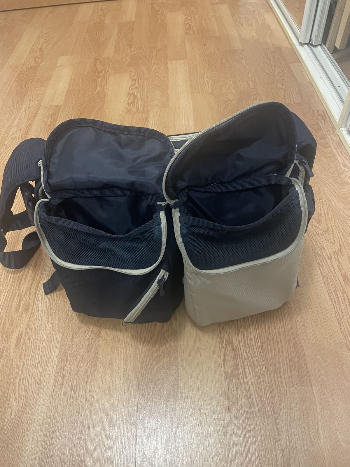 Taška má 3 velké a 2 malé kapsy. Ve velkých je spousta kapsiček na zip a uchycení na gumičku.