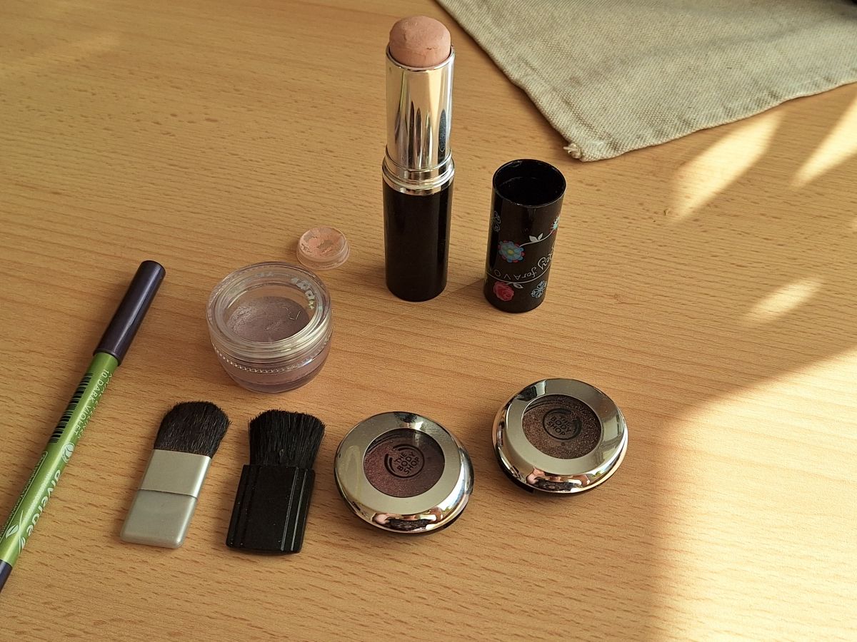 Korektor - hodne svetly, stiny perletove - hneda, perlet mastna - lila, , ceruzks fialova perlet, 2 stetecky na lice. Vsechno viz foto. Pouzite, stale v poradku, delsi sobu stalo v zasuvce